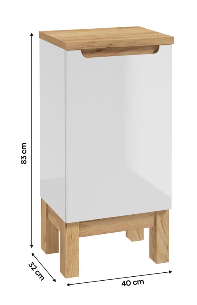 Dekoratívne nožičky v teplom odtieni zlatého duba zaručujú stabilitu a dizajnové zladenie s ostatnými prvkami kolekcie. Jedny dvierka s pohodlným frézovaným úchytom skrývajú vnútornú policu, ktorá uľahčuje organizáciu kúpeľňových potrieb.