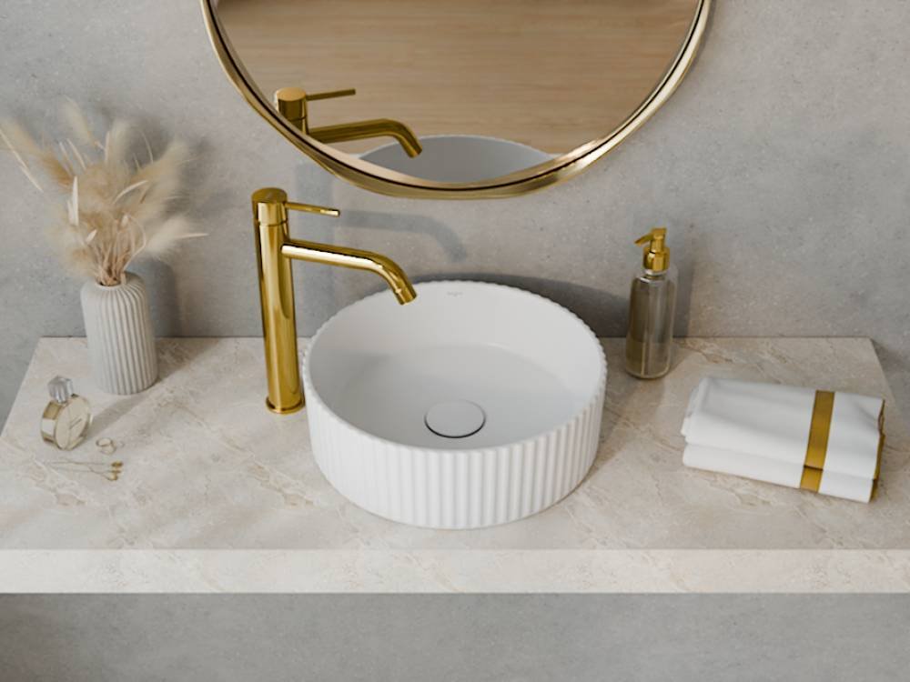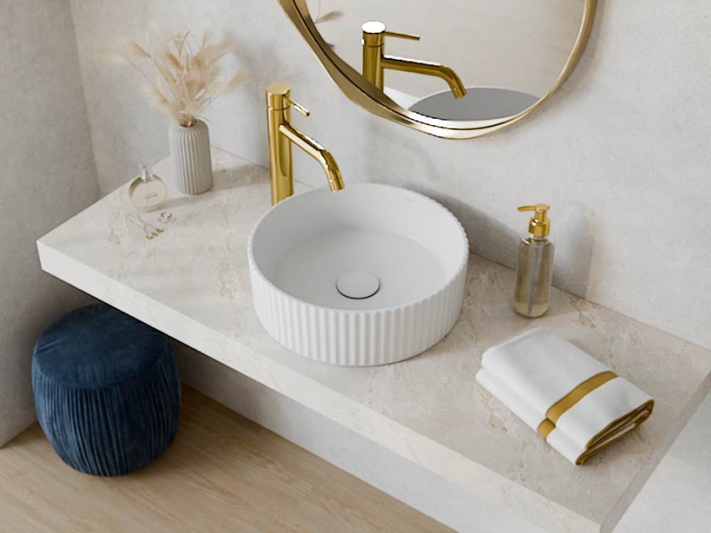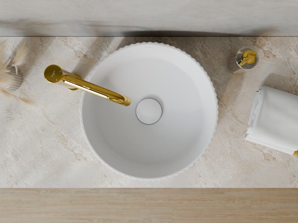 Vďaka univerzálnemu okrúhlemu tvaru (Ø 36 cm) sa umývadlo výborne hodí na väčšinu stolových dosiek a priestorov. Neobsahuje predvŕtaný otvor pre batériu, čo vám umožní voľne si zvoliť batériu podľa svojho štýlu a potrieb. Ide o ideálne riešenie pre dizajnové kúpeľne, hotelové izby aj moderné domáce wellness zóny.