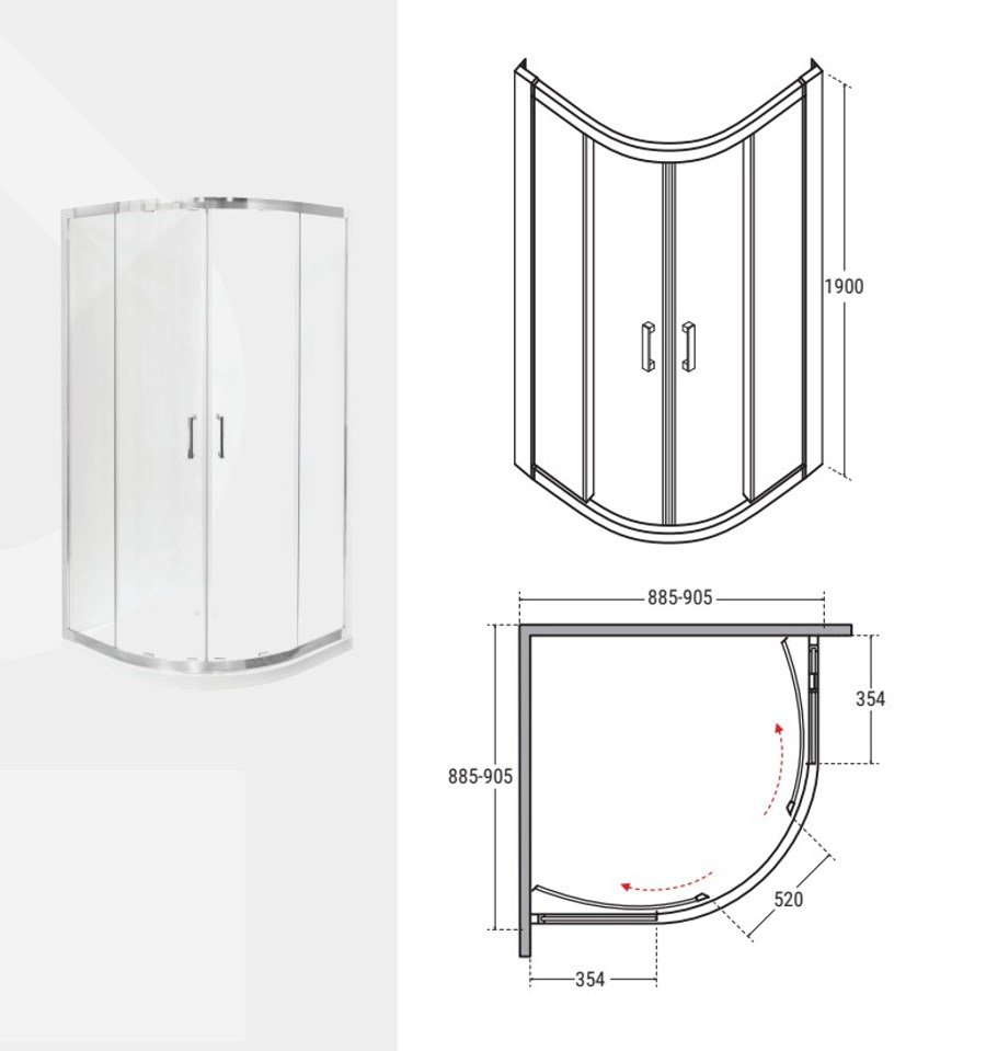 Rozmery: 90 × 90 × 190 cm, vhodné pre kúpeľne so štandardným priestorom.