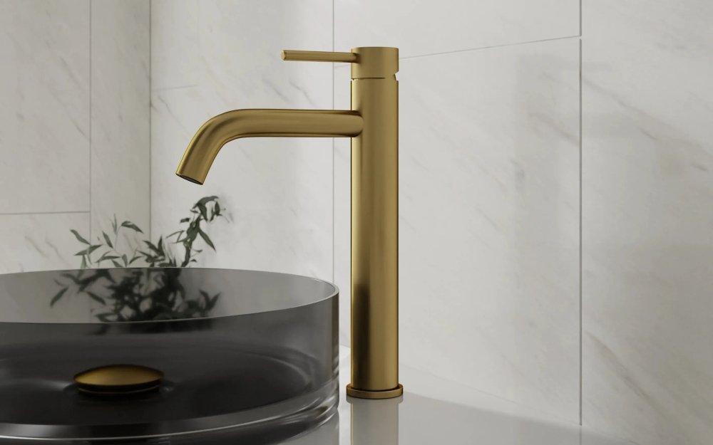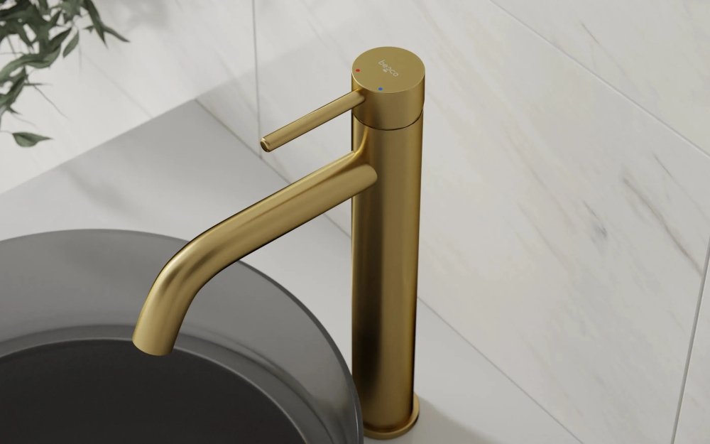 Umývadlová batéria vysoká Besco VEO I brúsené zlato je ideálnym riešením pre moderné kúpeľne s umývadlami na dosku. Vysoké prevedenie poskytuje dostatok priestoru pre pohodlné používanie a zároveň pôsobí elegantne a luxusne.