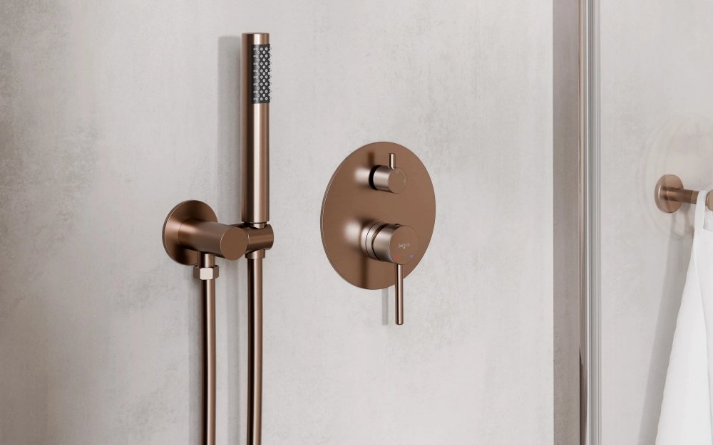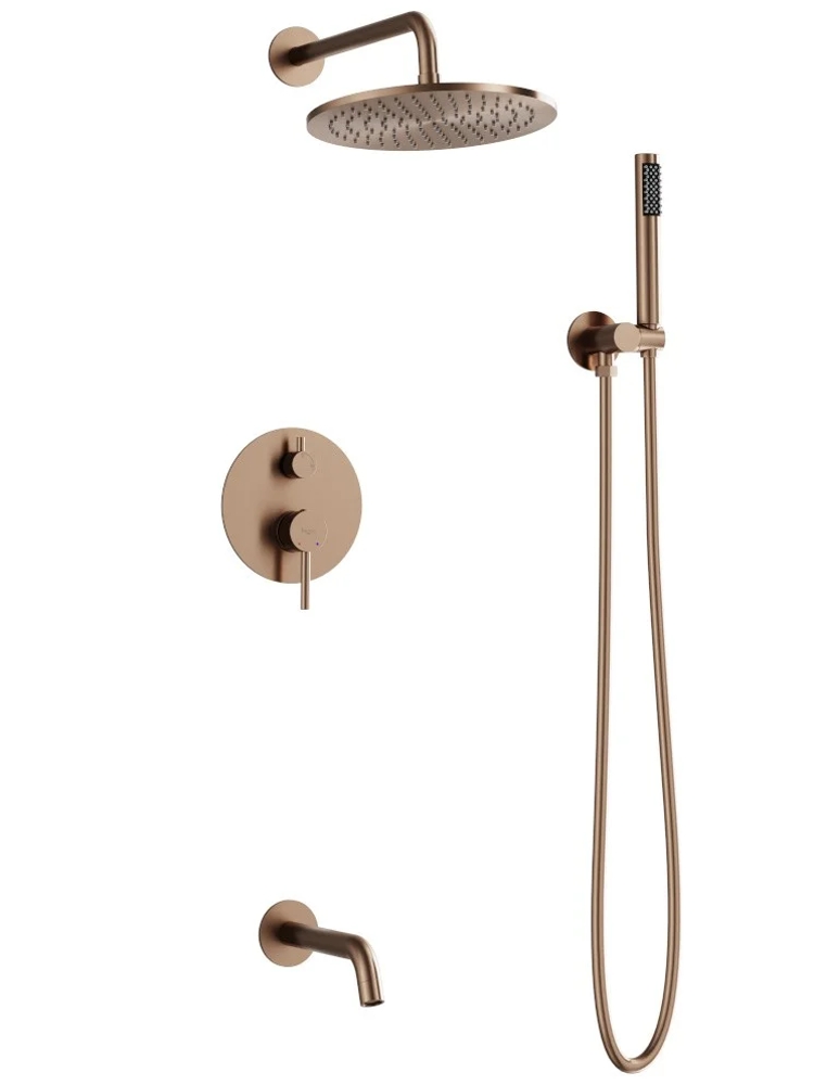 Podomietkový sprchový set Decco / Illusion I / Veo (brúsená meď) ponúka moderný dizajn, kompletné riešenie pre sprchový kút a vysoký komfort používania. Set obsahuje podomietkovú batériu s montážnym boxom, hlavovú sprchu, ručnú sprchu, hadicu (150 cm) a vývod s držiakom.