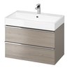 Kúpeľňový nábytok z kolekcie VIRGO concept je spojením funkčnosti, elegancie a modernosti. Skrinky v tejto sérii majú čierne, matné, kovové úchytky, ktoré budú dokonale ladiť so zvyškom vybavenia vašej kúpeľne. Skrinky VIRGO s doskou sú vyrobené z drevotriesky so štruktúrou dreva vo farbe dub sivý (čelá), s matnou povrchovou úpravou bokov korpusu a vrchnej dosky. Dve praktické zásuvky sú vybavené systémom „soft-close“. Vo vnútri hornej zásuvky je výrez pre sifón s krytom. Dno zásuviek pokrýva jemná sivá ľanová štruktúra. Nábytok sa predáva zmontovaný.