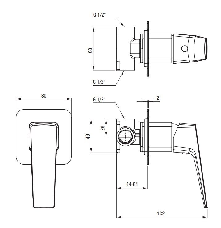 Keramická kartuša s priemerom 35 mm zabezpečuje plynulú a spoľahlivú reguláciu vody, pričom spoľahlivo odoláva opotrebovaniu. Hĺbka montáže je v rozmedzí 44 až 64 mm, takže batéria sa dá zapustiť prakticky do bežnej stavebnej hrúbky steny. Rozeta s rozmermi 80 × 80 mm zakrýva pripojenie a dodáva celému dizajnu precízny a dokončený vzhľad.