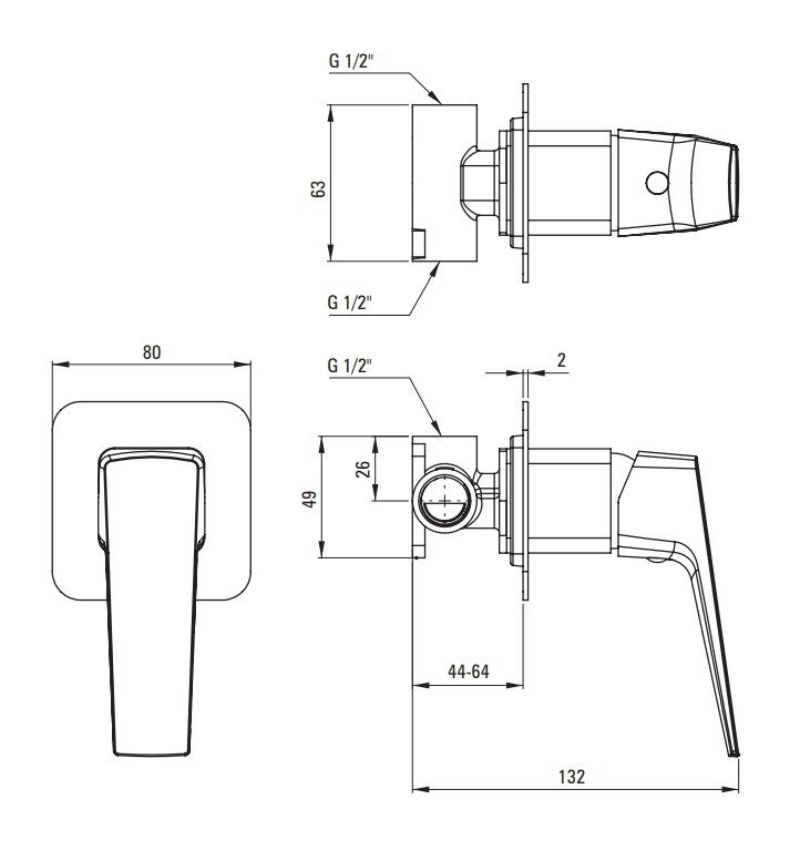 Keramická kartuša s priemerom 35 mm zabezpečuje plynulú a spoľahlivú reguláciu vody, pričom spoľahlivo odoláva opotrebovaniu. Hĺbka montáže je v rozmedzí 44 až 64 mm, takže batéria sa dá zapustiť prakticky do bežnej stavebnej hrúbky steny. Rozeta s rozmermi 80 × 80 mm zakrýva pripojenie a dodáva celému dizajnu precízny a dokončený vzhľad.