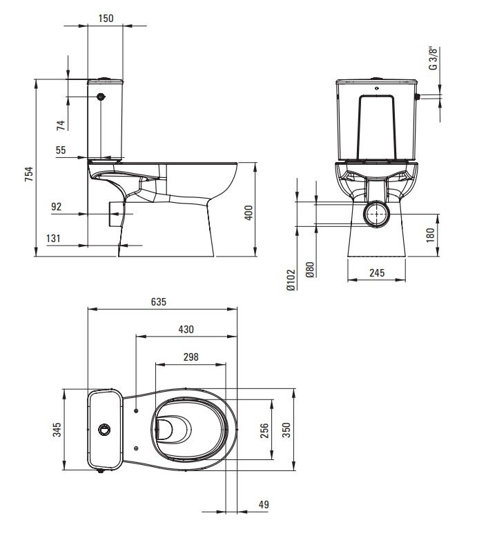 Kompaktný dizajn znamená, že misa a nádržka sú spojené v jednej jednotke — to zjednodušuje montáž a šetrí miesto. Rozmery misy sú 635 × 350 mm, výška celej jednotky vrátane nádržky je 755 mm. Sedátko je mäkko dovieracie (soft-close), čím sa eliminuje búchanie a predlžuje životnosť.