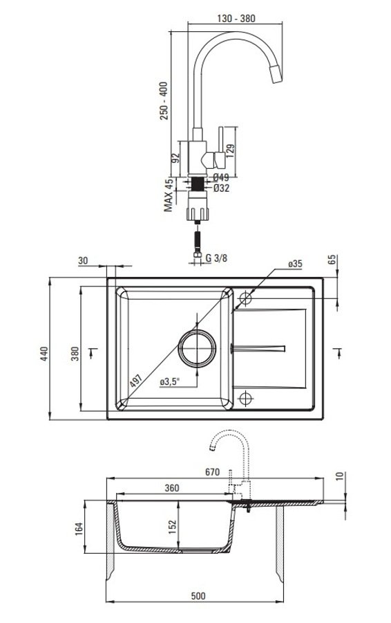 Tento drez je vyrobený z kvalitného kompozitného granitu, ktorý odoláva nárazom, vysokým teplotám (až do 250 °C), termickému šoku, UV žiareniu, chemikáliám a farebným zmenám — v súlade s normou európskej kvality. Povrch je matný a vďaka hydrofóbnej úprave voda a nečistoty stekajú samé — drez zostáva dlhšie čistý a údržba je jednoduchšia.