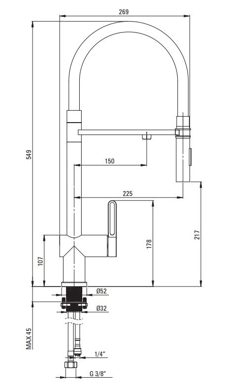 Rozmery: výška batérie 549 mm, dosah výtokovej hubice 225 mm, výška výtoku 217 mm (vhodné aj pre vysoké hrnce a nádoby)