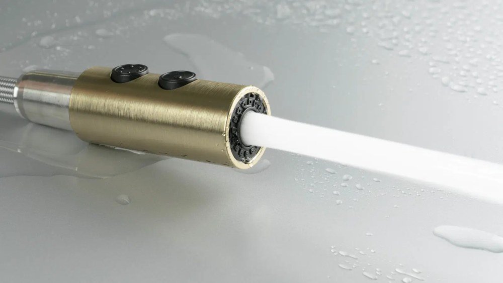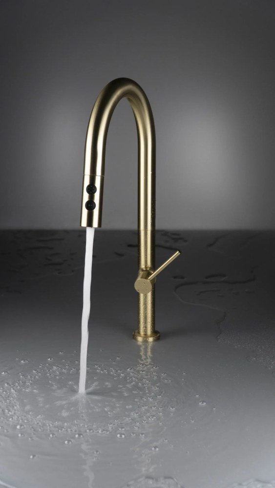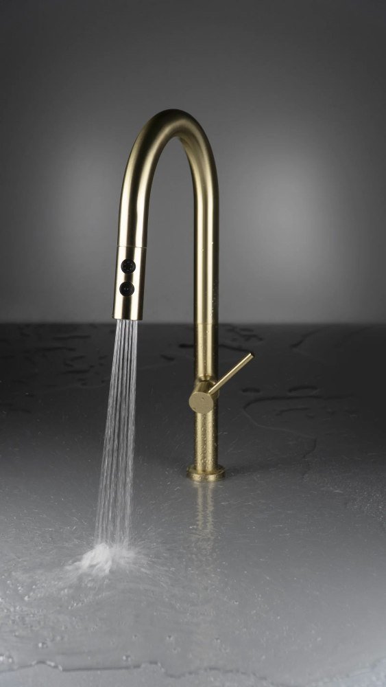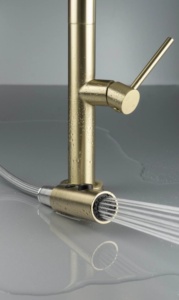 Luxusná kuchynská batéria Deante Olfato v odtieni brúseného zlata s vysúvacou výlevkou a dvomi režimami prúdu (napenetený a dažďový). Praktická, elegantná a spoľahlivá vo všetkých ohľadoch.