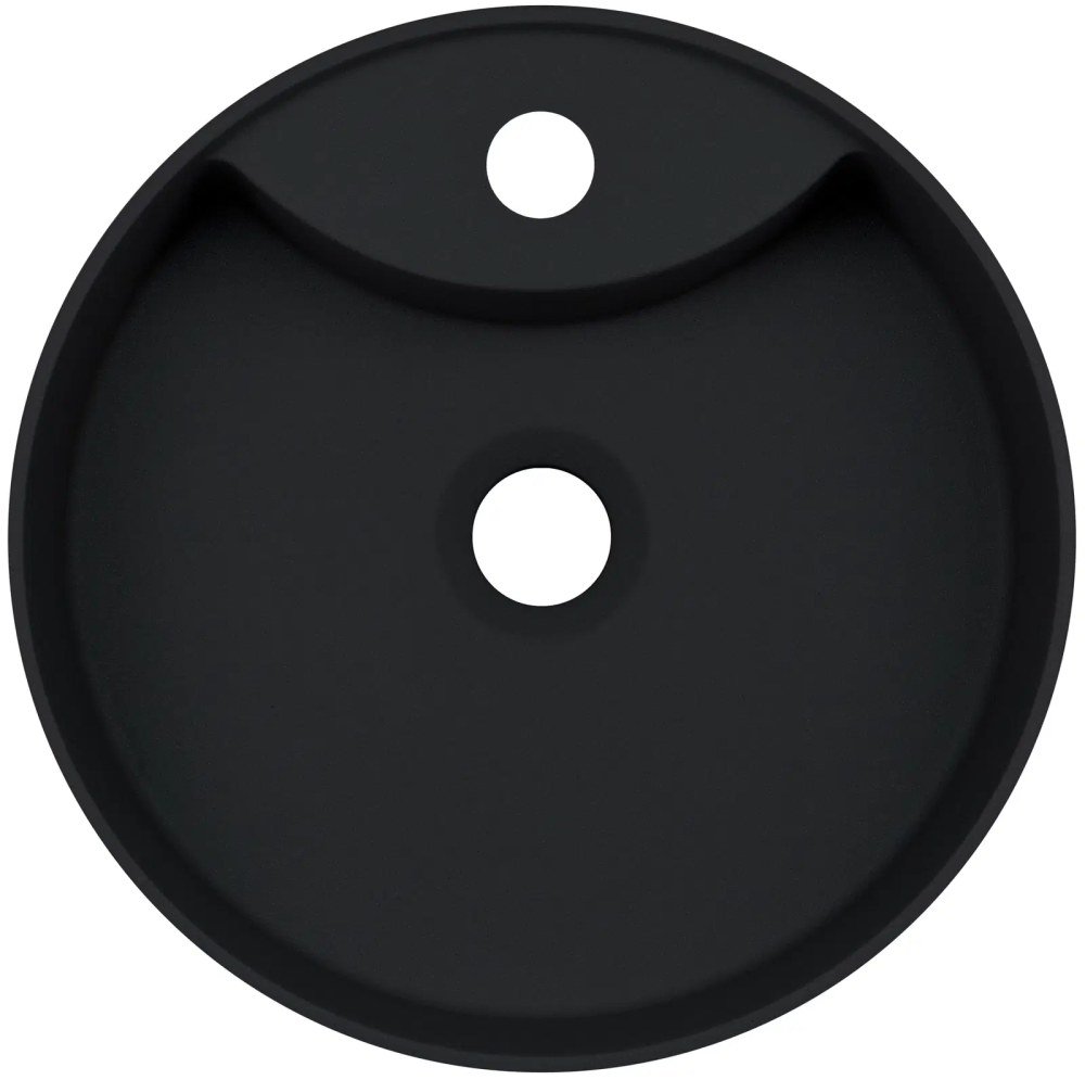 Elegantné okrúhle granitové umývadlo Deante Silia v odtieni nero, určené na položenie na dosku. S integrovaným ostrovčekom pre batériu (otvor), bez klasického prepadu – povrch hladký a minimalistický. Materiál s antibakteriálnymi vlastnosťami vďaka iónom striebra, odolný voči škvrnám, vysokým teplotám a nárazom.