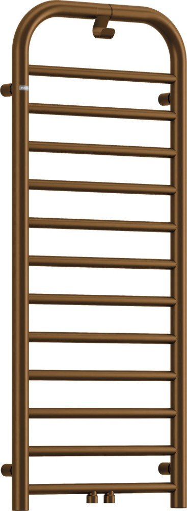 Dekoratívny kúpeľňový radiátor s výškou 1210 mm v matnom bronzovom (brąz mat) prevedení. Model typu vodno‑elektrický s integrovaným vešiakom na uteráky, možnosťou doplnenia elektrickej vykurovacej tyče pre prevádzku mimo vykurovacej sezóny.