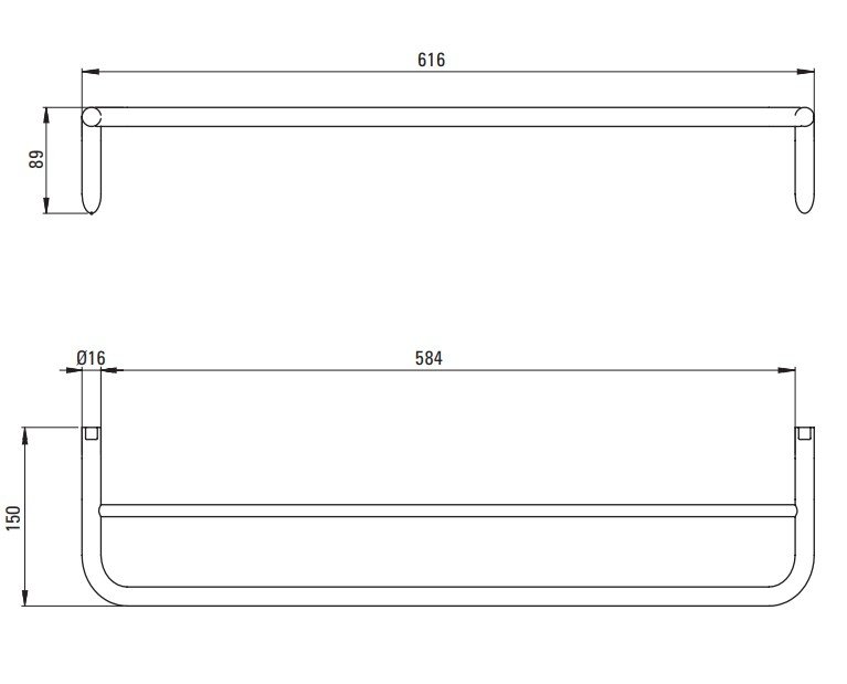 Tvar a rozmer vešiaka – výška 89 mm, šírka 616 mm, výsuv od steny 150 mm – zabezpečujú, že uteráky zostanú odstupom od steny a dobre vetrané. Vďaka dvojramennému prevedeniu je možné efektívne rozložiť priestor tak, aby sa uteráky nevzájomne nedotýkali a zle schnutia.