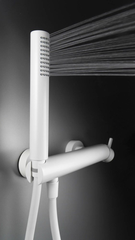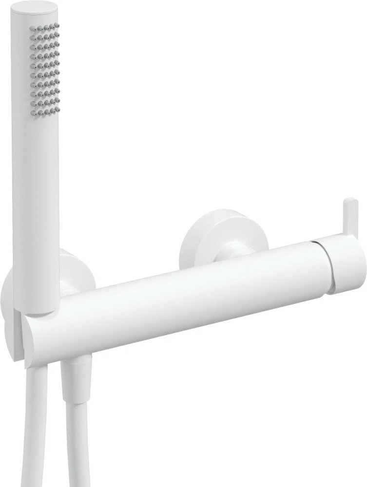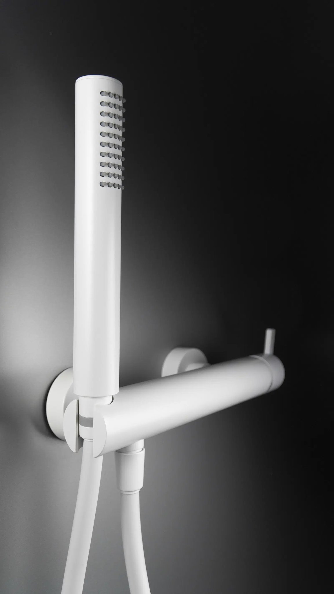 Štýlová sprchová batéria so sprchovým setom Silia od Deante v matnej bielej povrchovej úprave (Bianco). Obsahuje jednoručkové ovládanie, hadicu dĺžky 1,5 m, sprchovú hlavicu s Anti‑Calc ochranou a systémom Cool‑out, Anti‑twist hadicu a integrovaný držiak sprchy v tele batérie. Vhodná pre nástennú montáž, prúdová trieda A, hlučnostná trieda I