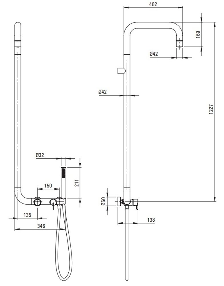 Sprchový stĺp je navrhnutý tak, že držiak ručnej sprchy je integrovaný priamo v tele batérie — netreba vŕtať ďalšie otvory a estetika zostáva čistá. Prepínač medzi hornou sprchou a ručným režimom je keramický Click – spoľahlivý aj pri nízkom tlaku vody.