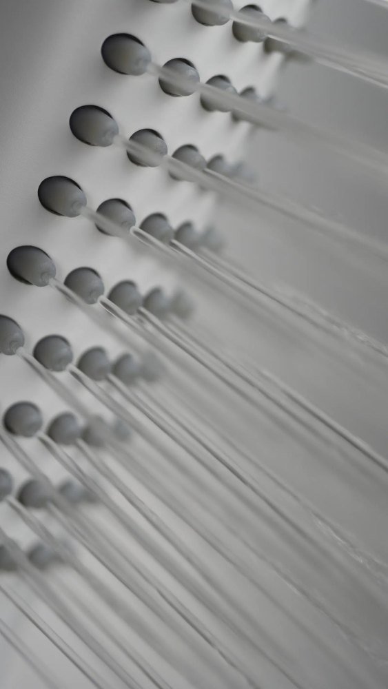 Anti‑Calc systém v sprchovej hlavici (silikónové výstupky), ktoré umožňujú jednoduché odstránenie vodného kameňa jemným zotretím prstom.