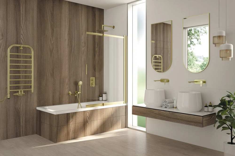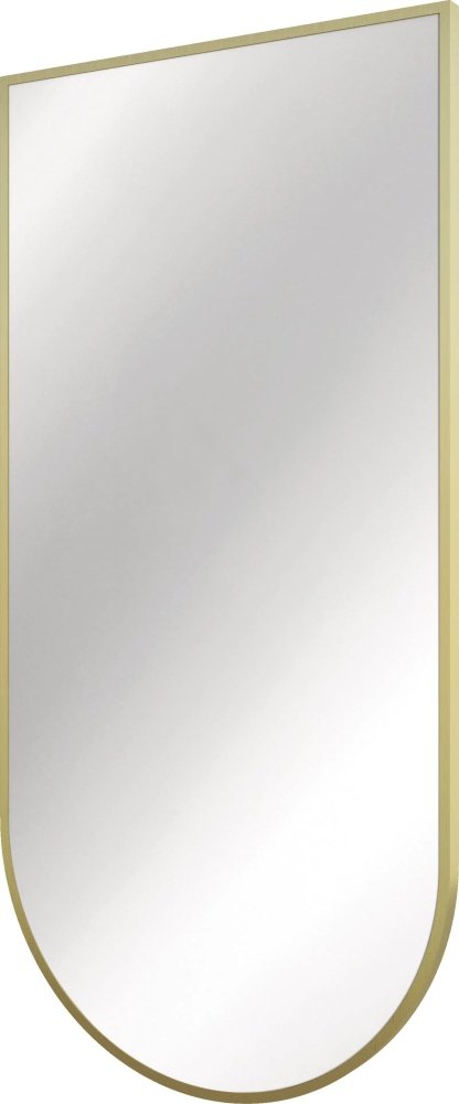 Elegantné závesné zrkadlo v ráme so štýlovým matne zlatým (brushed gold) prevedením. Asymetrický dizajn a možnosť montáže vo viacerých polohách robia z tohto modelu nielen praktický, ale aj dekoratívny prvok do modernej kúpeľne.