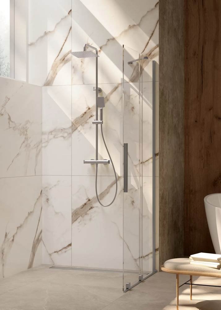 Veľká horná daždová sprcha + flexibilná ručná sprcha — možnosť komfortného sprchovania „na stojato“ alebo ručného sprchovania podľa potreby.
