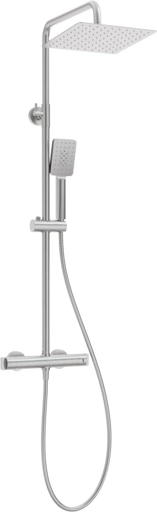 Povrchová úprava je vbrúsenom prevedení, čo dodáva sprche klasický a nadčasový vzhľad. Sprchový set je navrhnutý tak, aby vydržal roky: oceľový stĺp, kvalitné mosadzné časti batérie a spoľahlivé spätné ventily, ktoré zabraňujú spätnému toku vody. Navyše systém Anti-Calc a ergonomické ovládacie prvky umožňujú jednoduché čistenie a príjemné používanie. Produkt je vhodný do moderných, minimalistických kúpeľní i do interiérov s tradičným alebo industriálnym štýlom.