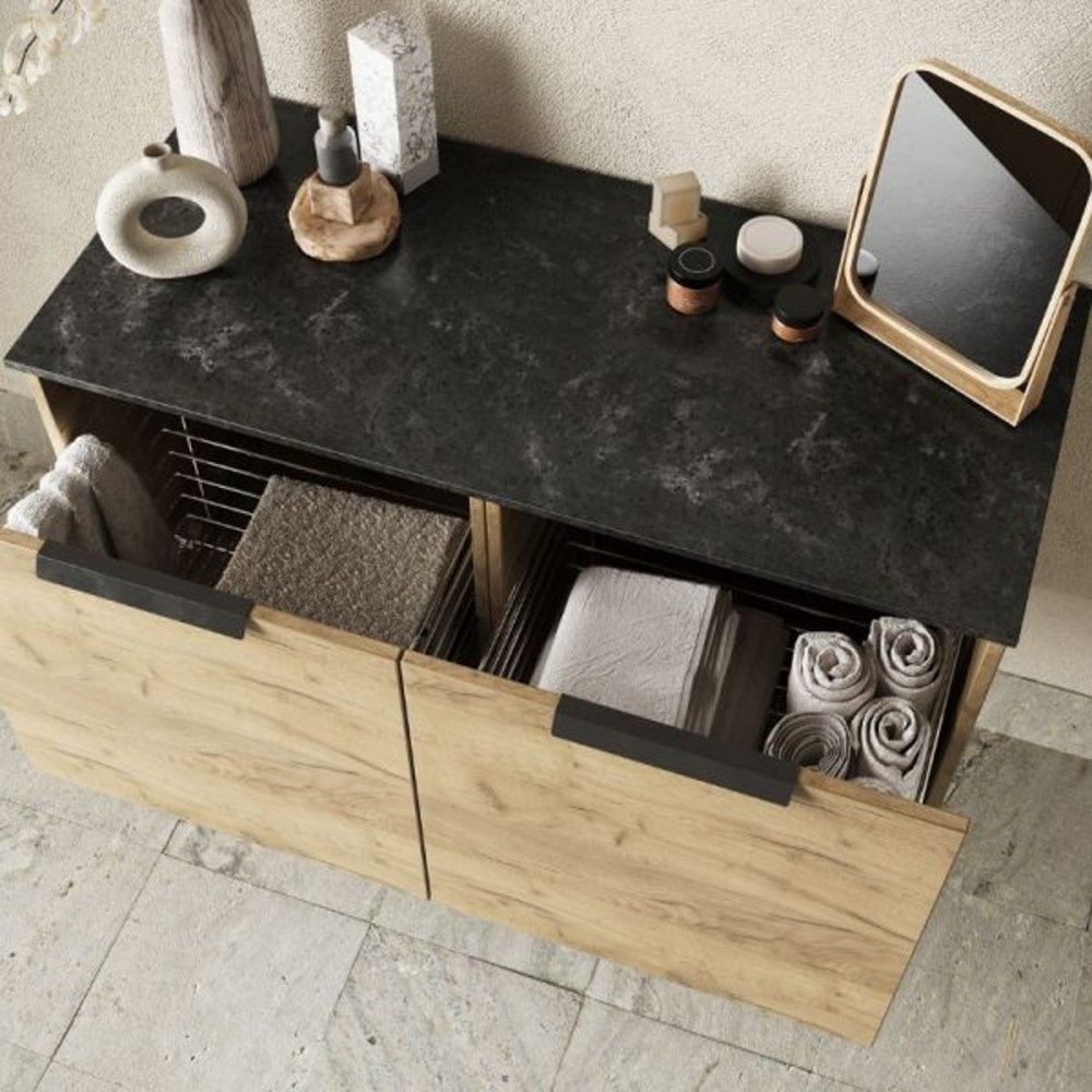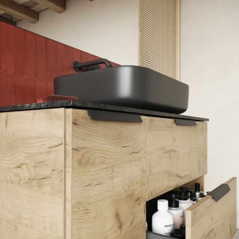 Dekor „Etna Black“ prináša hlbokú čiernu farbu s jemnou textúrou pripomínajúcou prírodný kameň. Výsledok je luxusný a elegantný – ideálny pre moderné kúpeľne, kde chcete vyjadriť štýl a prestíž. Vďaka HD-MACS® konglomerátu je povrch dosky neporézny, čo zabraňuje absorpcii vody a rastu baktérií. To z nej robí praktický a hygienický prvok do vlhkého prostredia kúpeľne.