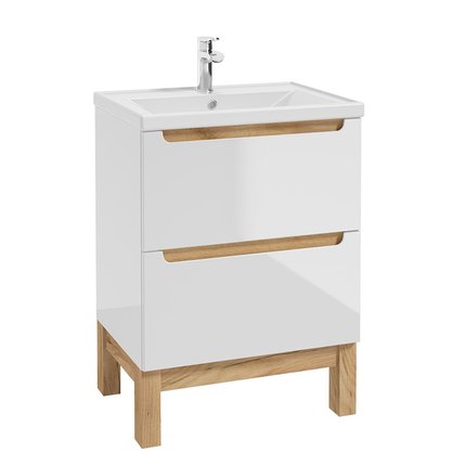 Umývadlová skrinka Defra Space System D60 je ideálnym riešením pre moderné kúpeľne, ktoré spájajú funkčnosť s estetikou. Korpus skrinky je vyrobený z kvalitnej laminovanej dosky s bielym lesklým povrchom, zatiaľ čo predné plochy sú z MDF dosky s rovnakou povrchovou úpravou. Dekoratívne nožičky v odtieni zlatého duba pridávajú skrinke teplý a príjemný vzhľad.