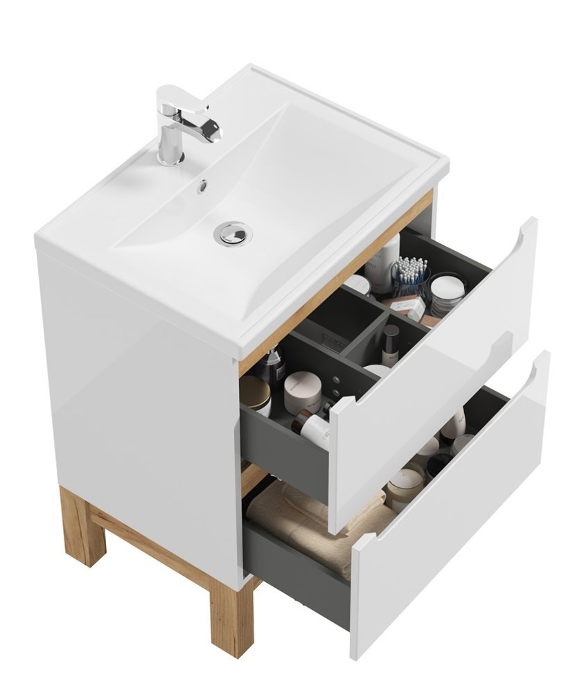 Skrinka je vybavená dvoma priestrannými zásuvkamii s integrovaným systémom soft-close, ktorý zabezpečuje tiché a plynulé dovretie. Vrchná zásuvka obsahuje praktické priehradky pre lepšiu organizáciu drobných kúpeľňových potrieb. Vďaka nožičkám je údržba podlahy jednoduchšia a kúpeľňa pôsobí vzdušnejšie.