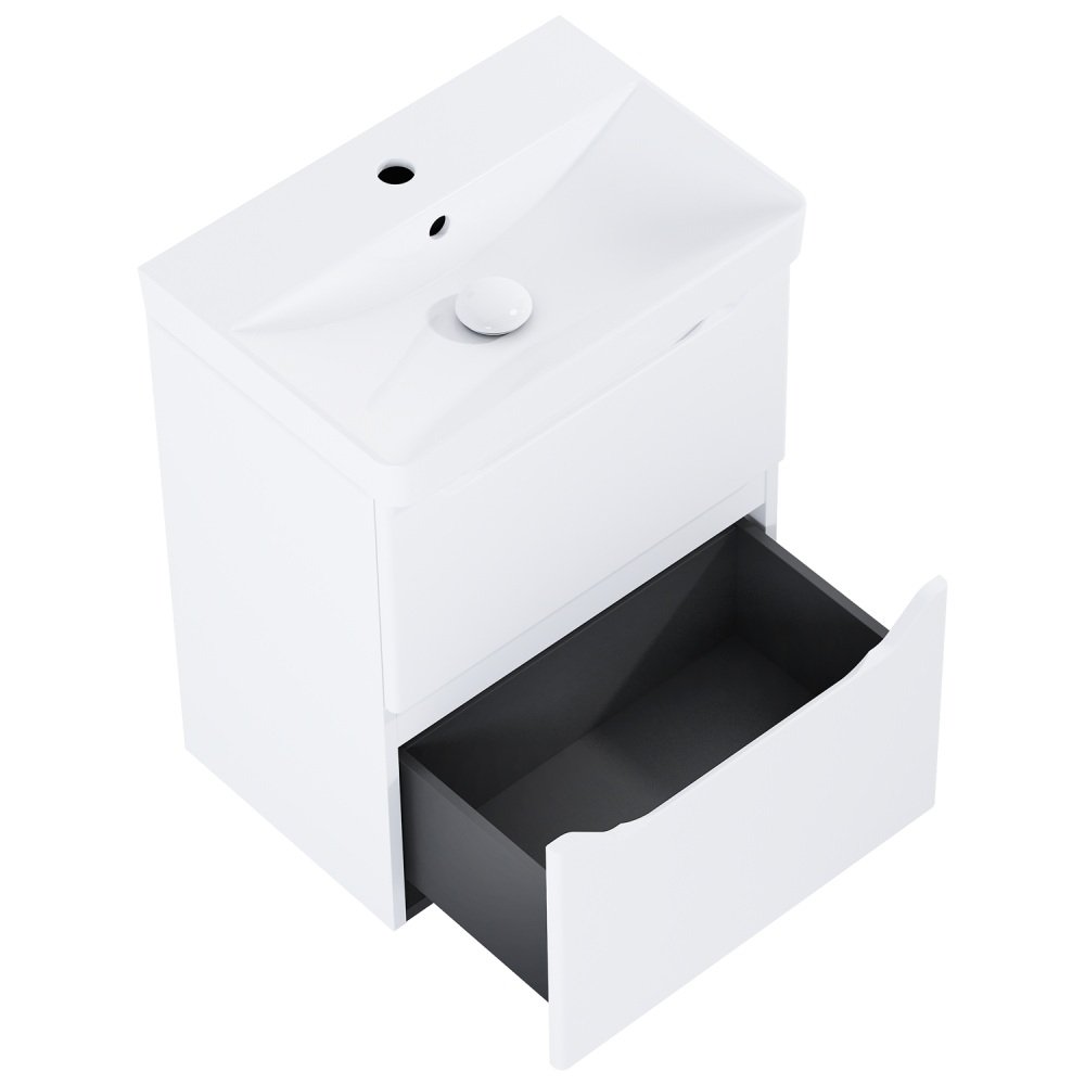 Moderný a priestranný kúpeľňový set – skrinka so zabudovaným keramickým umývadlom v šírke 50,8 cm, v elegantnom matnom bielom prevedení. Dve plnovýsuvné zásuvky s tichým zatváraním, vysoká kvalita spracovania a jednoduchá montáž-zavesenie robia z tohto modelu ideálne riešenie pre stredne veľké kúpeľne.