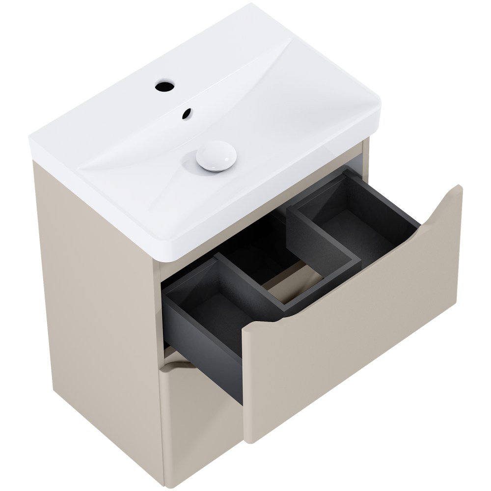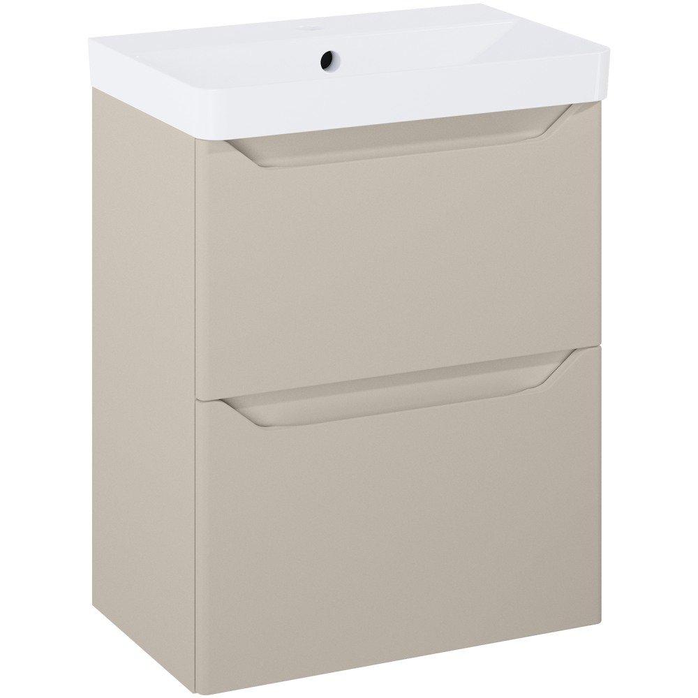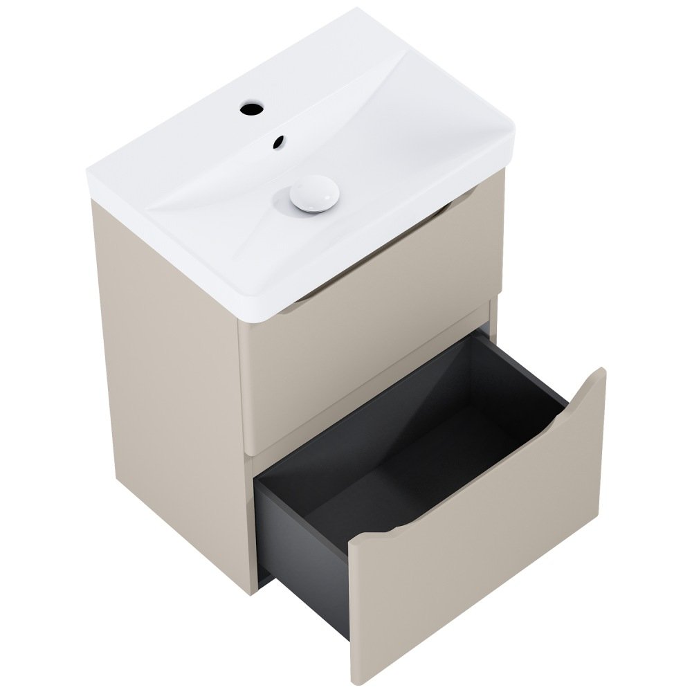 Luxusný kúpeľňový set šírky cca 50 cm v elegantnom a neutrálnom farebnom prevedení „fume matt“ (béžovo-sivý mat). Zostava obsahuje skrinku s dvoma plnovýsuvnými zásuvkami vybavenými tichým zatváraním (soft-close) a keramické umývadlo. Ideálne riešenie pre moderné kúpeľne, kde sa spája dizajn s funkčnosťou.