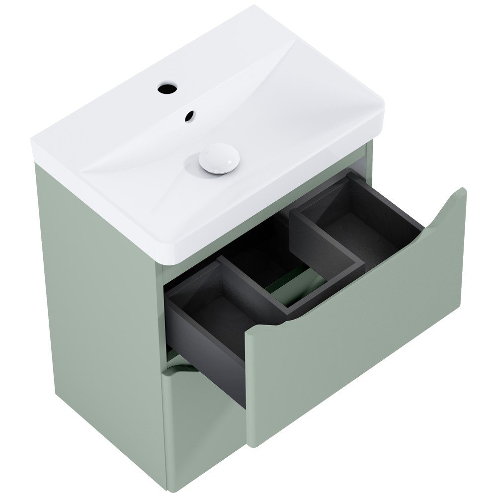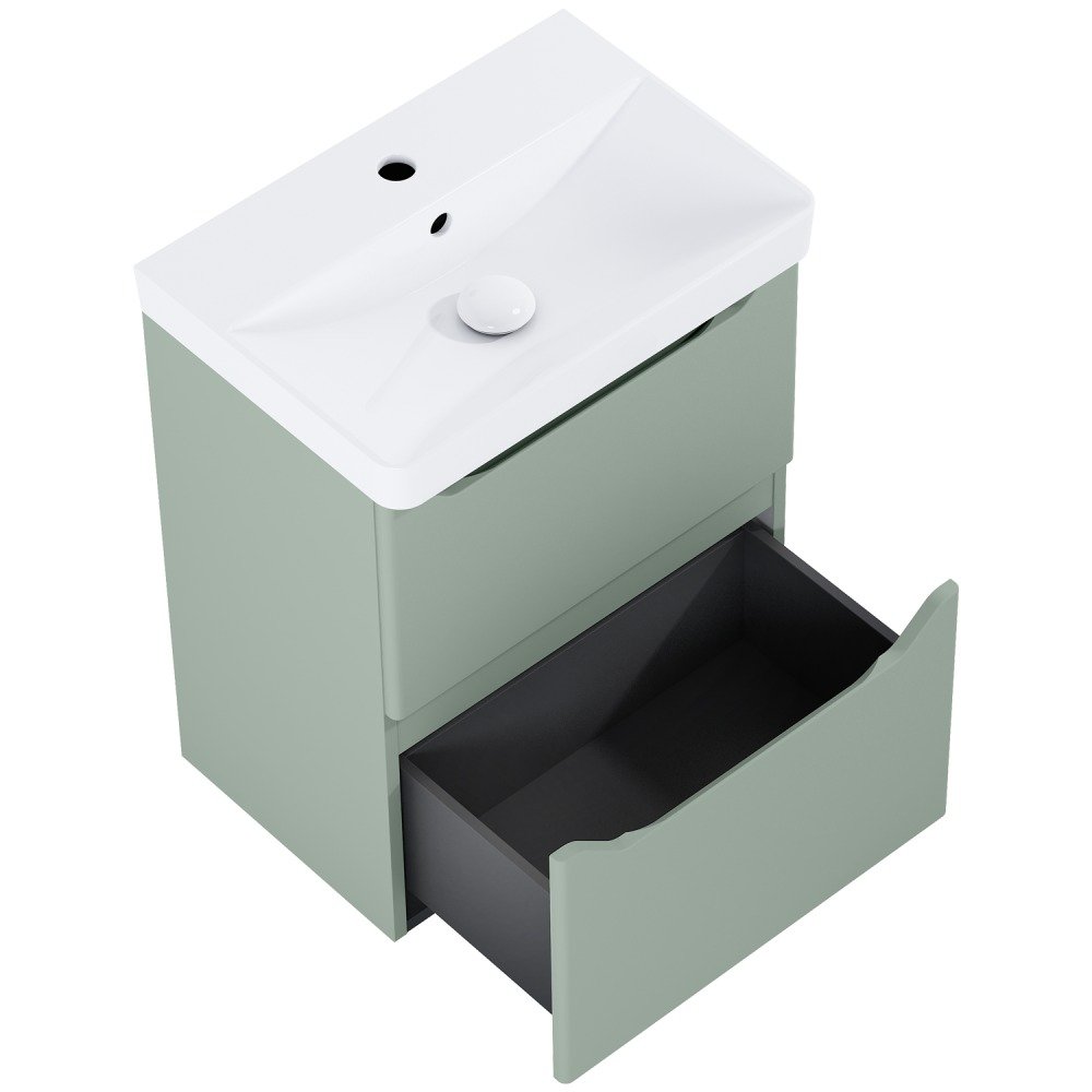 Elegantná a funkčná kúpeľňová zostava v šírke 50 cm v trendy odtieni šalvie (sage mat). Obsahuje skrinku so 2 plnovýsuvnými zásuvkami a keramické umývadlo. Ideálne riešenie pre stredne veľké kúpeľne, kde výnimočný dizajn stretáva vysokú funkčnosť.