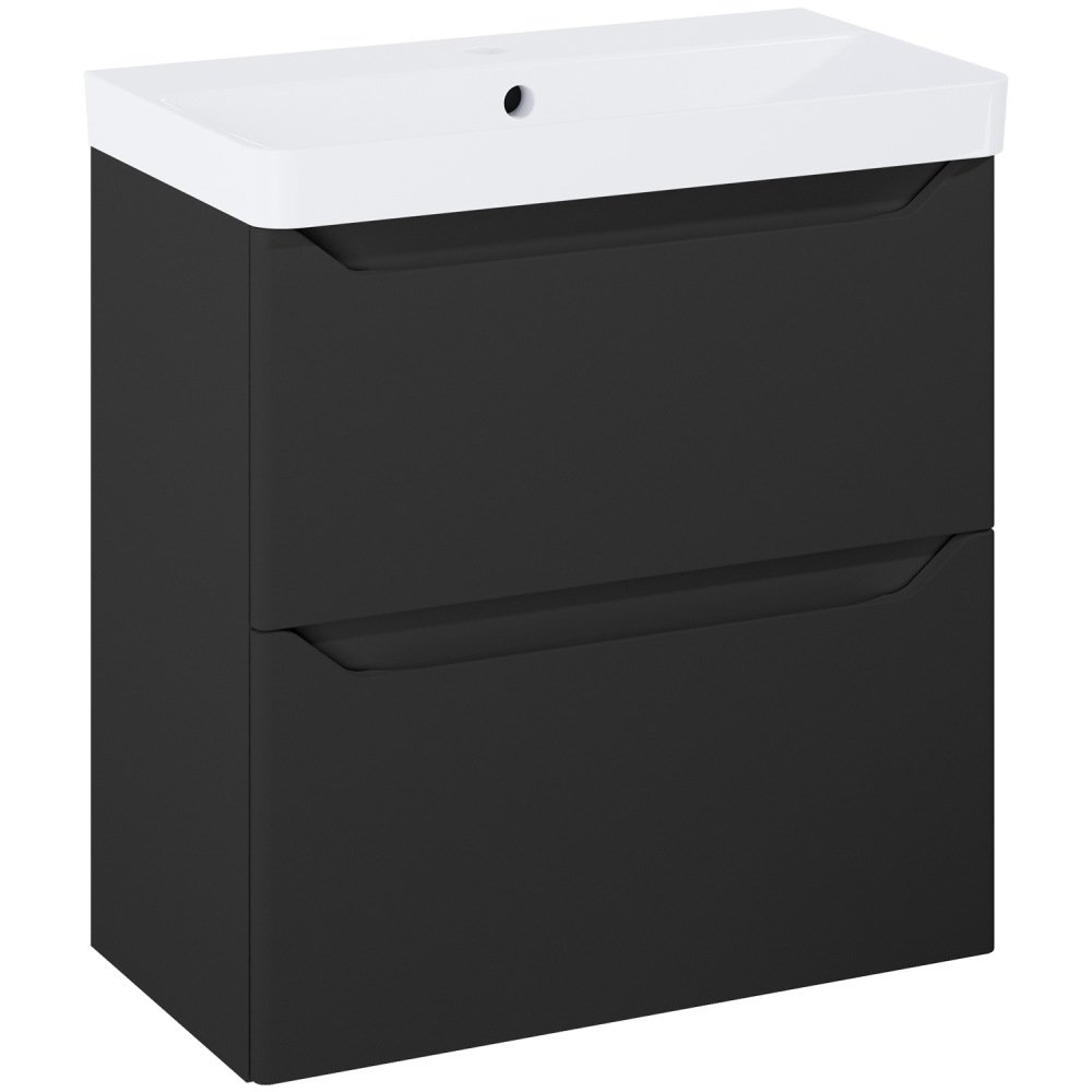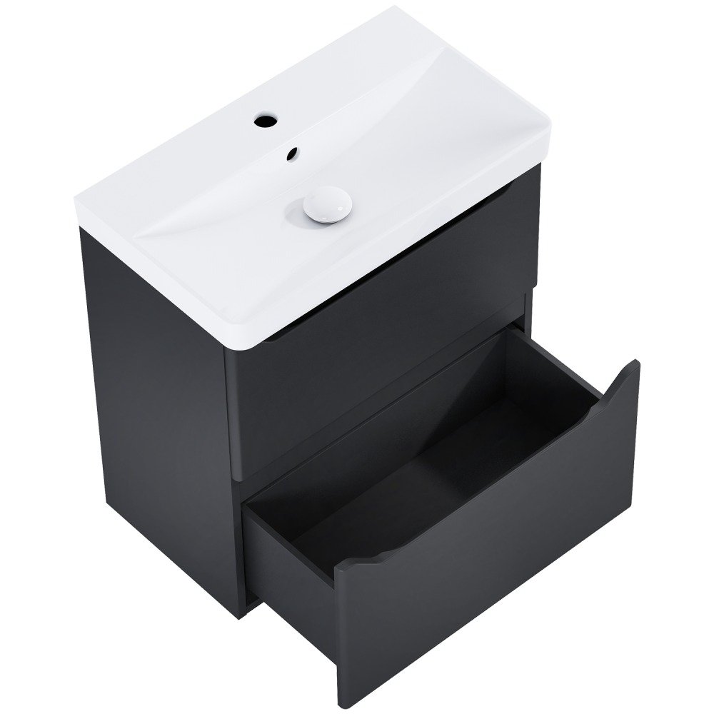 Elegantný set do kúpeľne: skrinka s dvomi plnovýsuvnými zásuvkami a keramickým umývadlom s šírkou približne 60 cm v modernom čiernom matnom prevedení. Dizajn, ktorý zaujme, a funkčnosť, na ktorú sa môžete spoľahnúť.