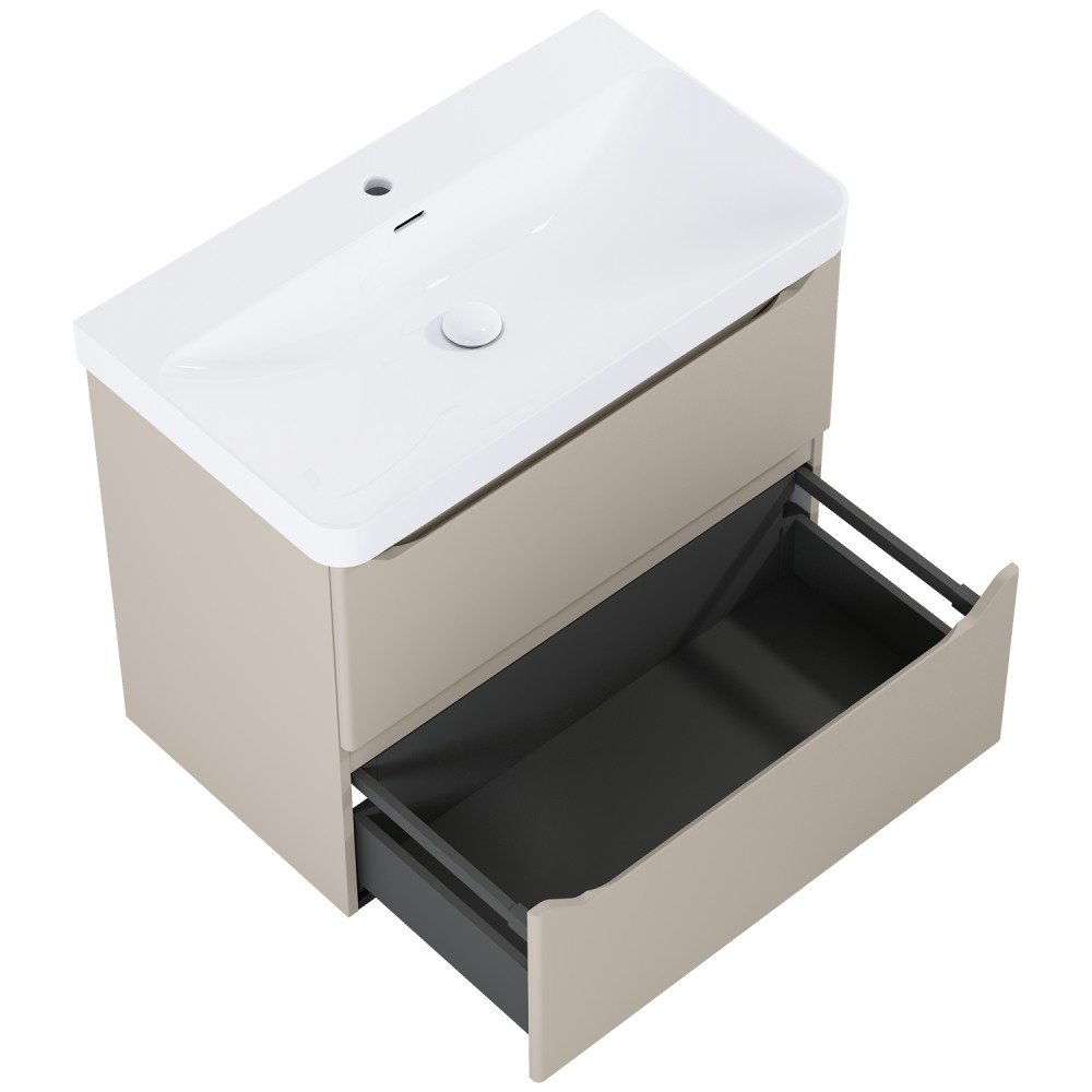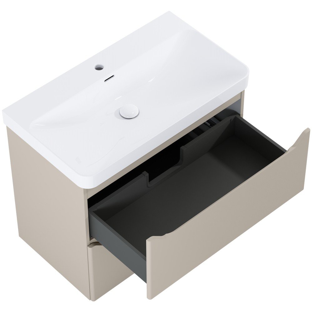 Luxusná závesná kúpeľňová skrinka šírky približne 78,5 cm v matnom a elegantnom odtieni „fume matt“ (béžovo-sivý mat). Dve plne vysúvateľné zásuvky s mechanizmom soft-close, minimalistický dizajn bez viditeľných úchytov, robustná nosnosť – ideálne riešenie pre väčšiu kúpeľňu s dôrazom na štýl aj funkciu.
