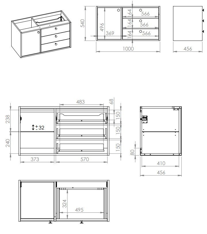 Skrinka disponuje tromi priestrannými zásuvkami a jednými dvierkami (pravé prevedenie), za ktorými sa nachádza nastaviteľná sklenená polica. Toto riešenie poskytuje dostatok úložného priestoru pre všetky kúpeľňové potreby a zároveň umožňuje ich prehľadné usporiadanie.