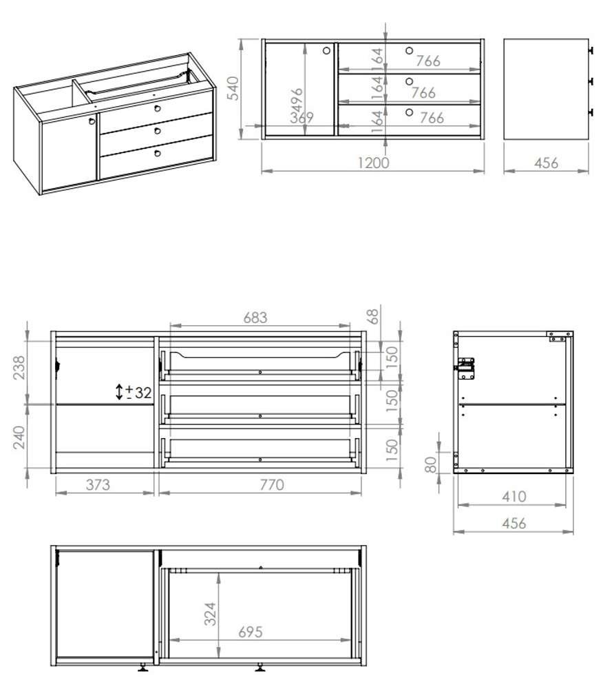 Skrinka je určená na kombináciu s doskou (blatom). Pri použití ako skrinka pod umývadlo je potrebné použiť umývadlo na dosku a priestorovo úsporný sifón. Produkt sa dodáva kompletne zmontovaný a bez úchytiek, čo umožňuje individuálne prispôsobenie dizajnu.