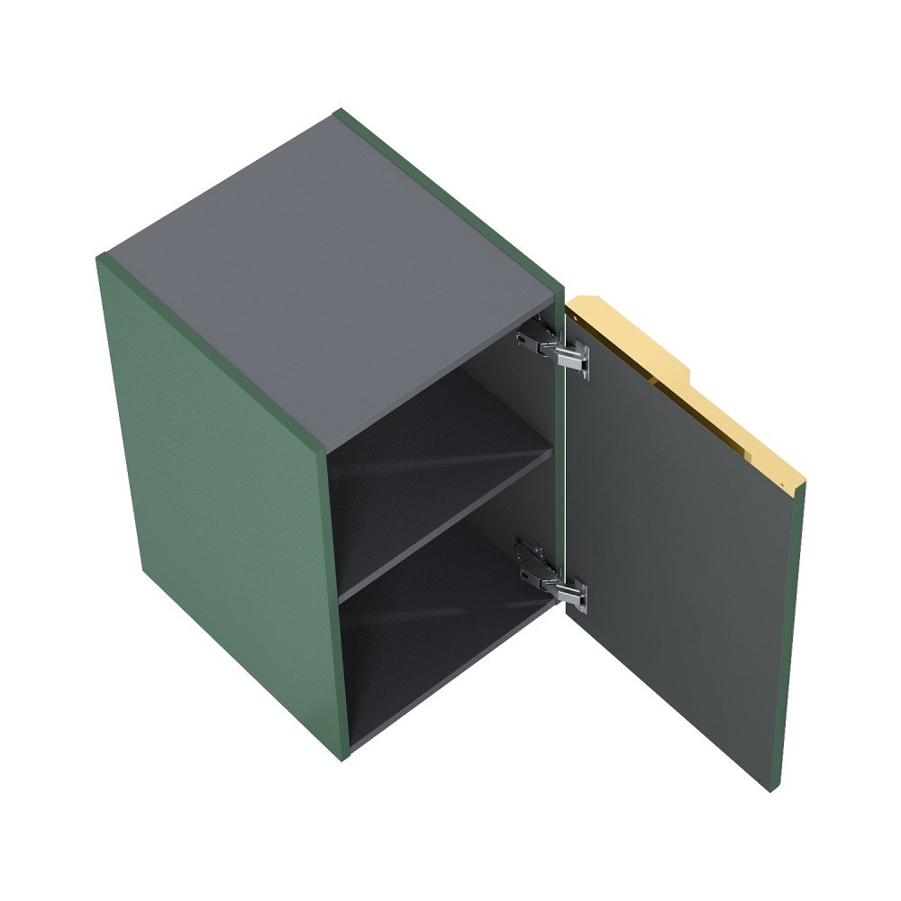 Závesná kúpeľňová komoda SOHO 40 v elegantnom matnom prevedení Forest Green s jednými dvierkami a ryhovaným sklom. Praktické riešenie do menších kúpeľní s tichým dovieraním, nastaviteľnou policou a vysokou nosnosťou konštrukcie.