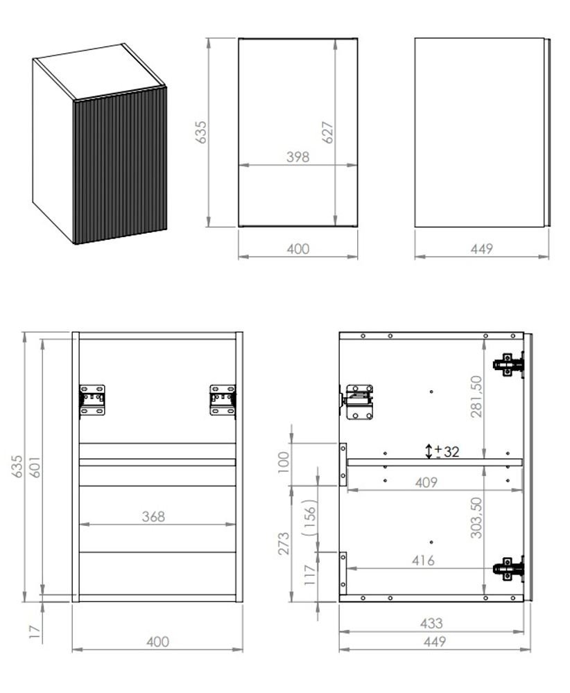 Prednú časť tvorí dekoratívne ryhované ornamentálne sklo, ktoré dodáva nábytku luxusný vzhľad a vytvára jemný optický efekt. Matná lakovaná povrchová úprava v odtieni Fume pôsobí elegantne a nadčasovo, pričom zároveň zabezpečuje zvýšenú odolnosť voči vlhkosti, teplotným zmenám a chemikáliám používaným v kúpeľni.
