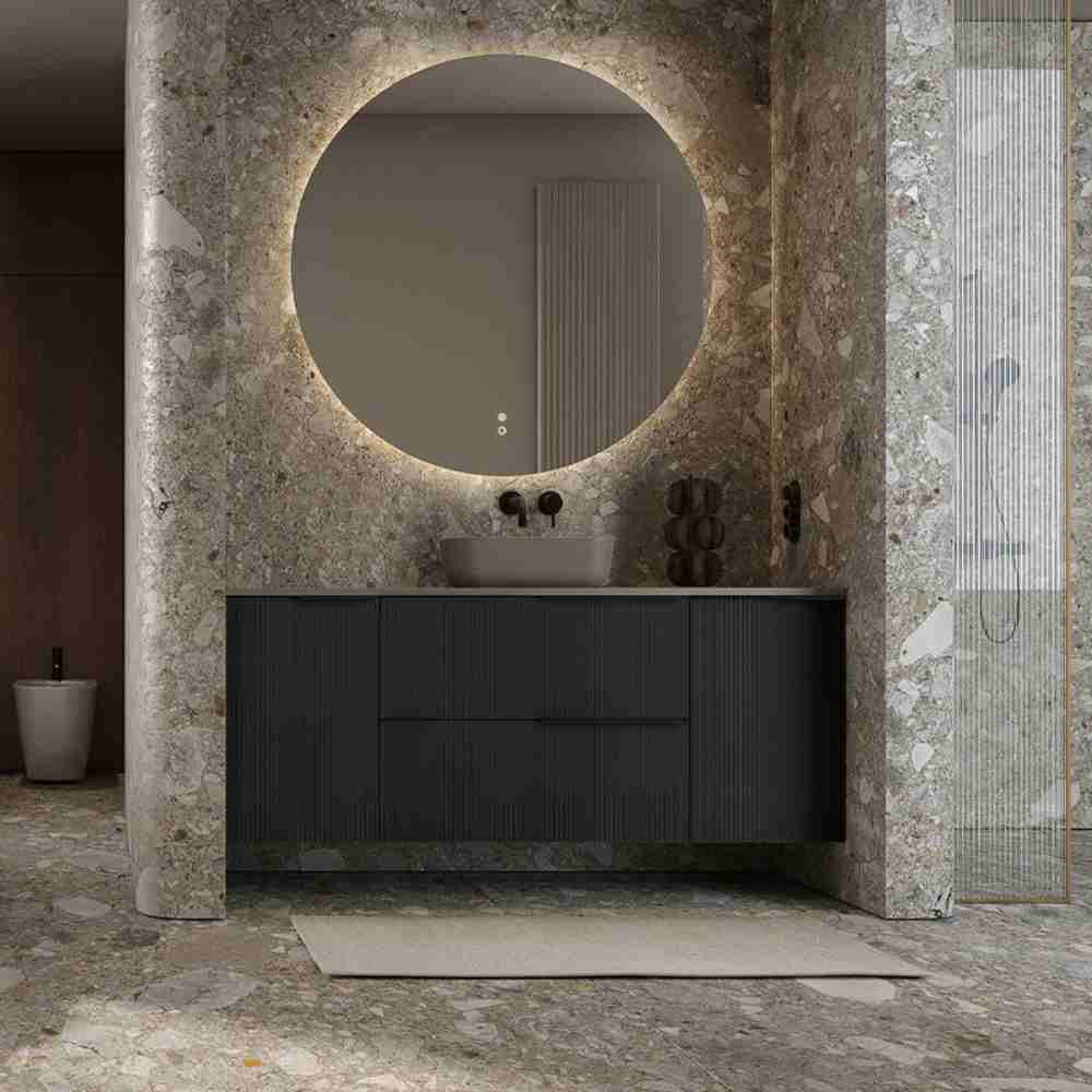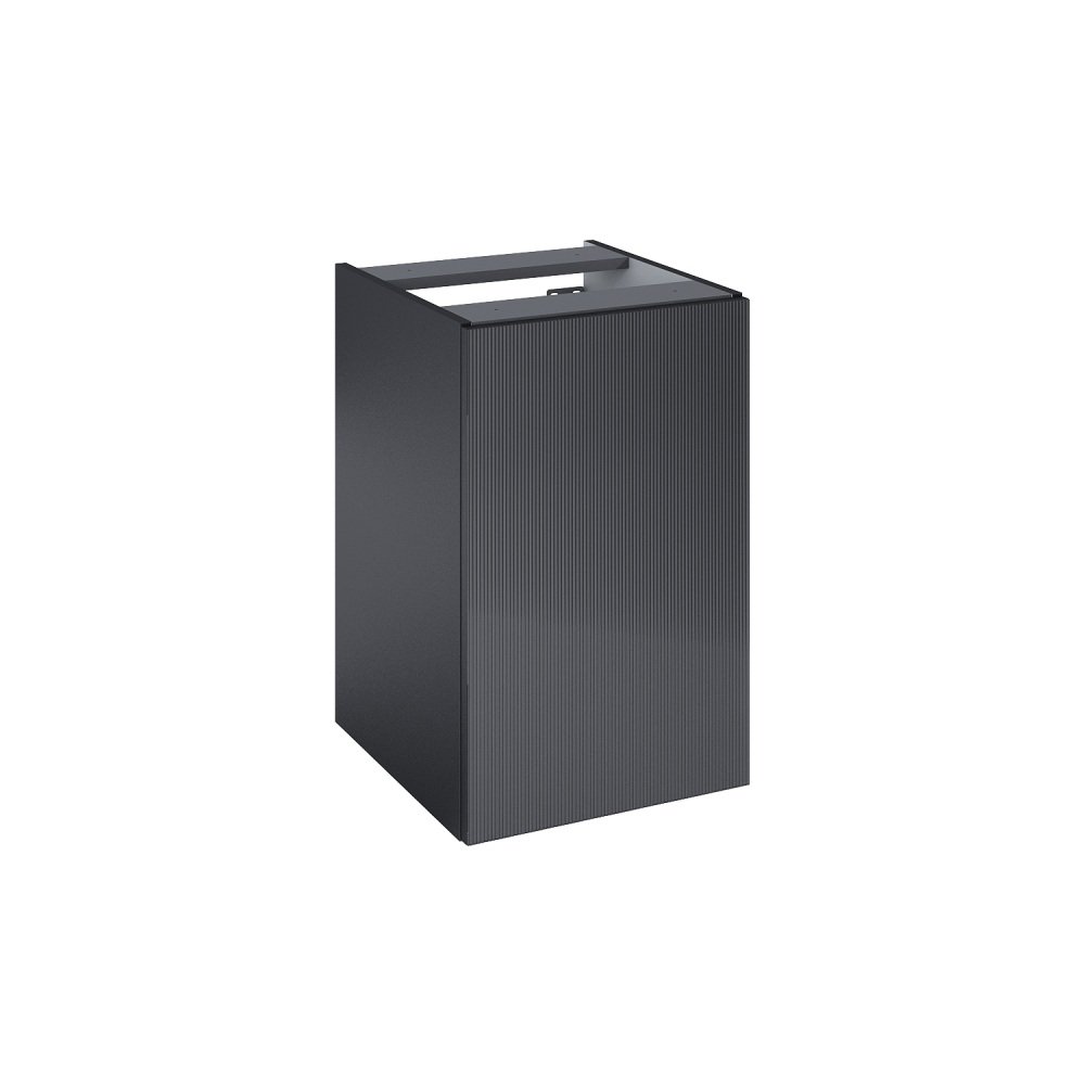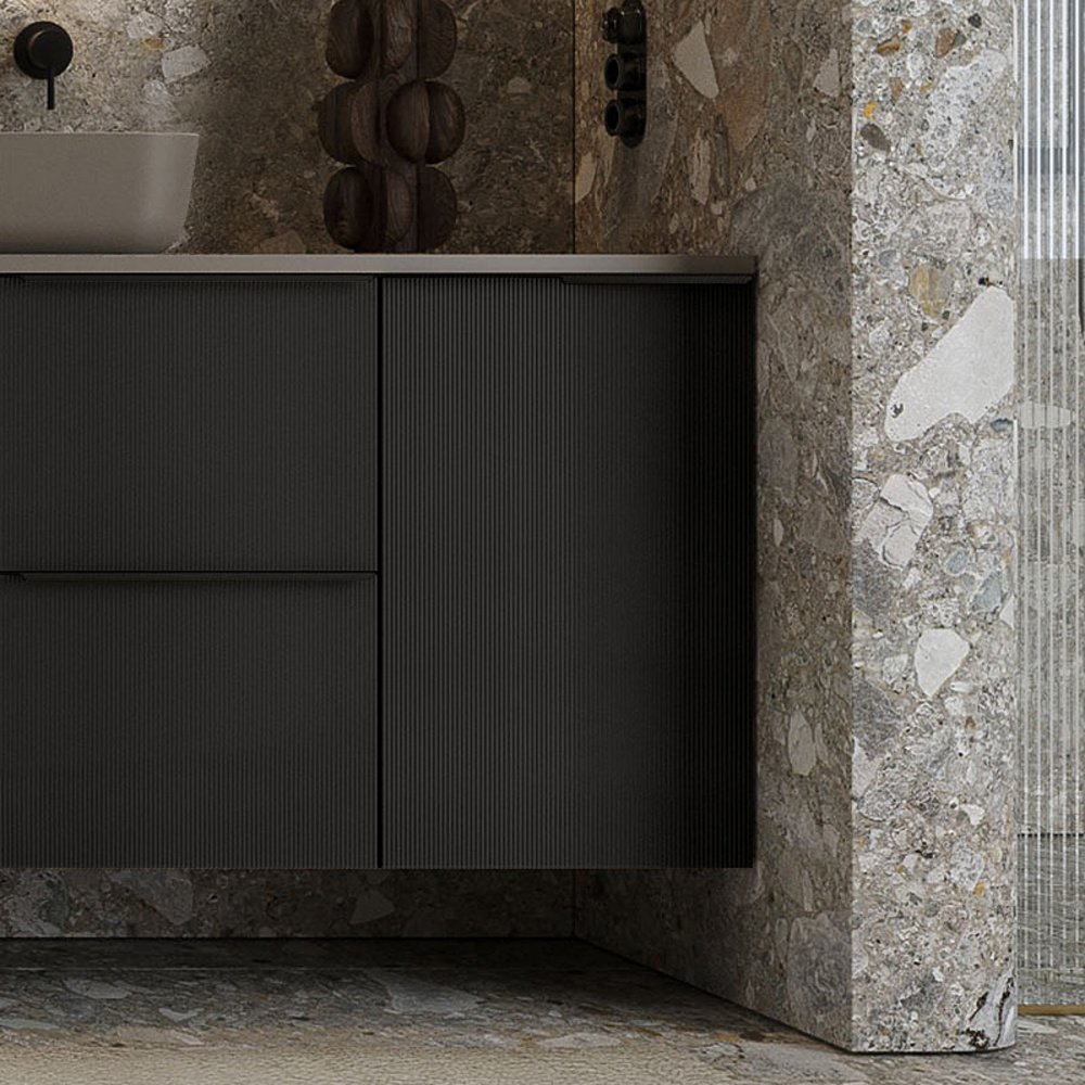 Dominantným dizajnovým prvkom je čelná plocha z ryhovaného ornamentálneho skla, ktorá dodáva nábytku luxusný a jedinečný vzhľad. Matná lakovaná povrchová úprava v čiernej matnej farbe pôsobí elegantne, nadčasovo a ľahko sa kombinuje s ostatným vybavením kúpeľne.