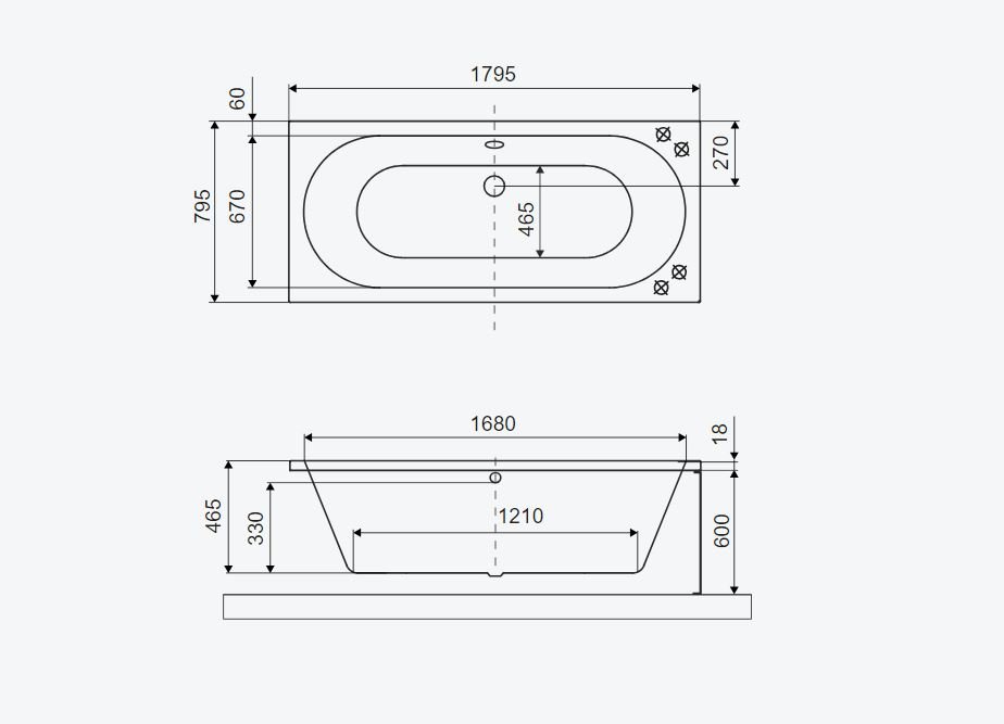 Vaňa sa dodáva bez odtokového systému a bez čelného panela. Odporúčaná montáž formou obmurovania alebo vlastného opláštenia.