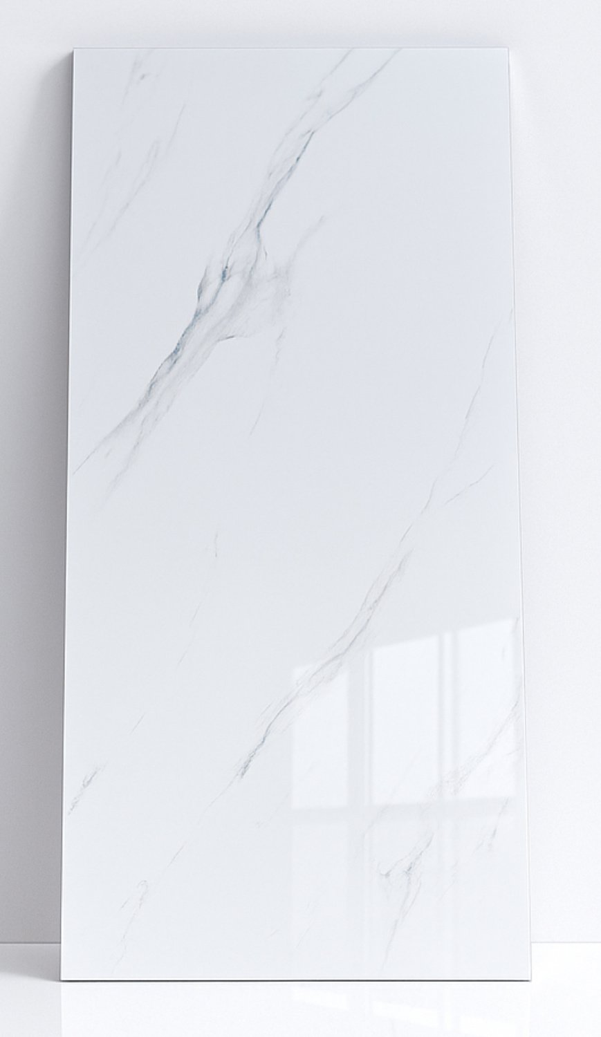 Luxusná lesklá gresová dlažba s realistickým mramorovým efektom. Rektifikovaný formát 60×120 cm je ideálny pre moderné a elegantné interiéry.