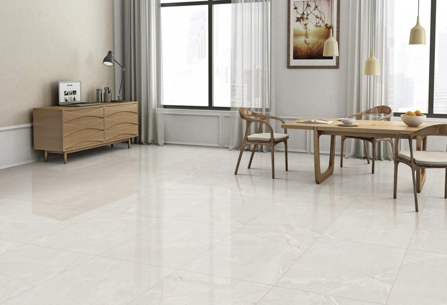 Dlažba vyniká jemným svetlým odtieňom medzi bielou a svetlou sivou. Lesklý povrch dodáva dlažbe elegantný charakter a pri svetle môže pôsobiť ako bledý mramor alebo hladký kameň s jemnými žilkami či odleskami.