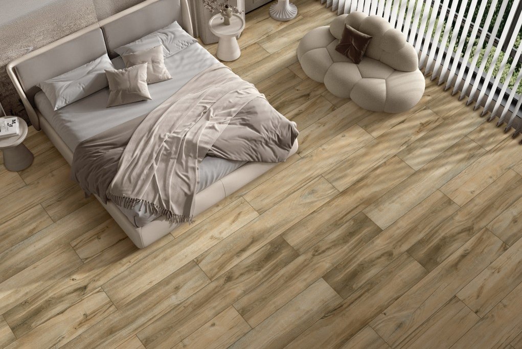 Rektifikovaná dlažba s realistickou kresbou dreva v teplom odtieni Honey. Spojenie prírodného vzhľadu a odolnosti bez nutnosti údržby.