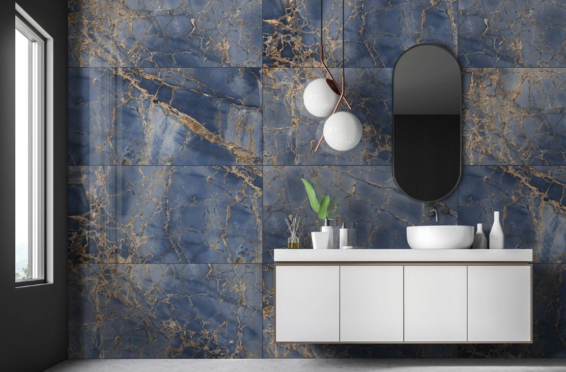 Zlaté prvky vnášajú do dlažby jemný lesk a hĺbku – nie sú rušivé, ale decentné, ako zlaté škrvny naukladané na modrom pozadí. Tento kontrast dovoľuje dlažbe pôsobiť zároveň elegantne aj odvážne.