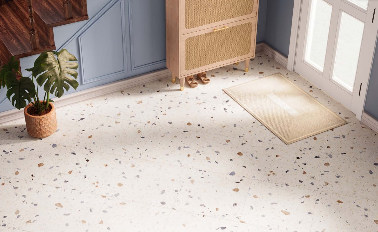 Dlažba Kompas Ivory Chips prináša moderný terrazzo vzhľad v svetlom krémovom tóne s jemnými kamienkovými akcentmi. Pôsobí hravo, ale zároveň elegantne a nadčasovo. Ideálna voľba, ak chceš do priestoru dostať charakter bez toho, aby bol rušivý.