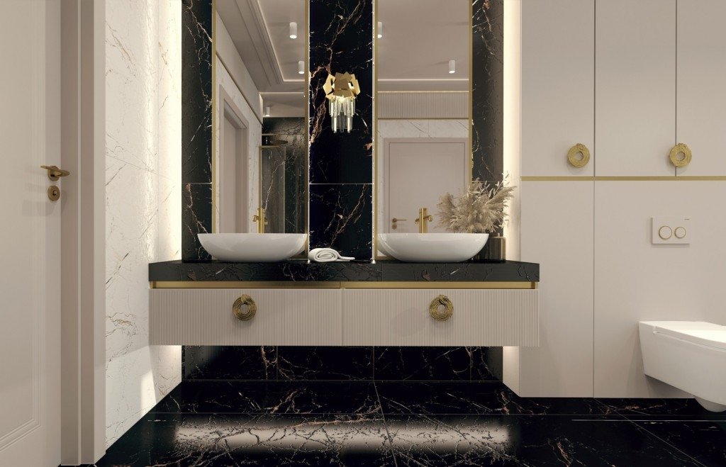 Kúpeľne a wellness priestory – ak sa správne zvolí osvetlenie a doplnky, čierna dlažba pôsobí veľmi elegantne; carving povrch môže pomôcť s bezpečnosťou pri zmene stavu povrchu