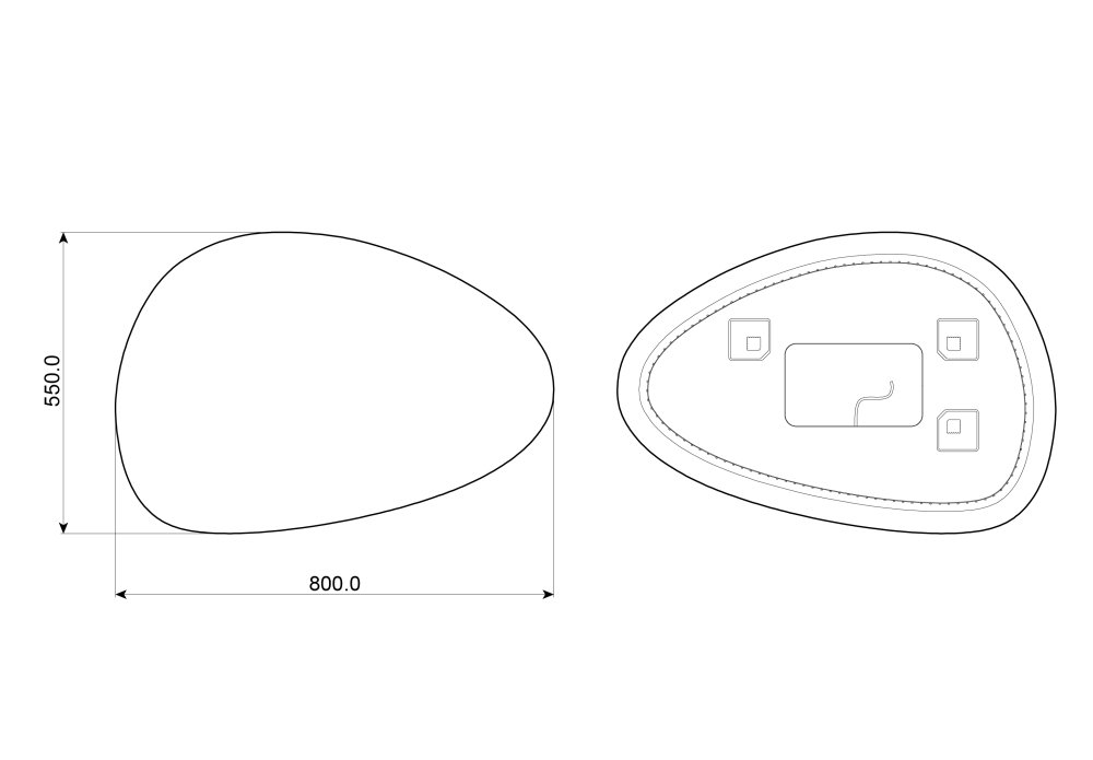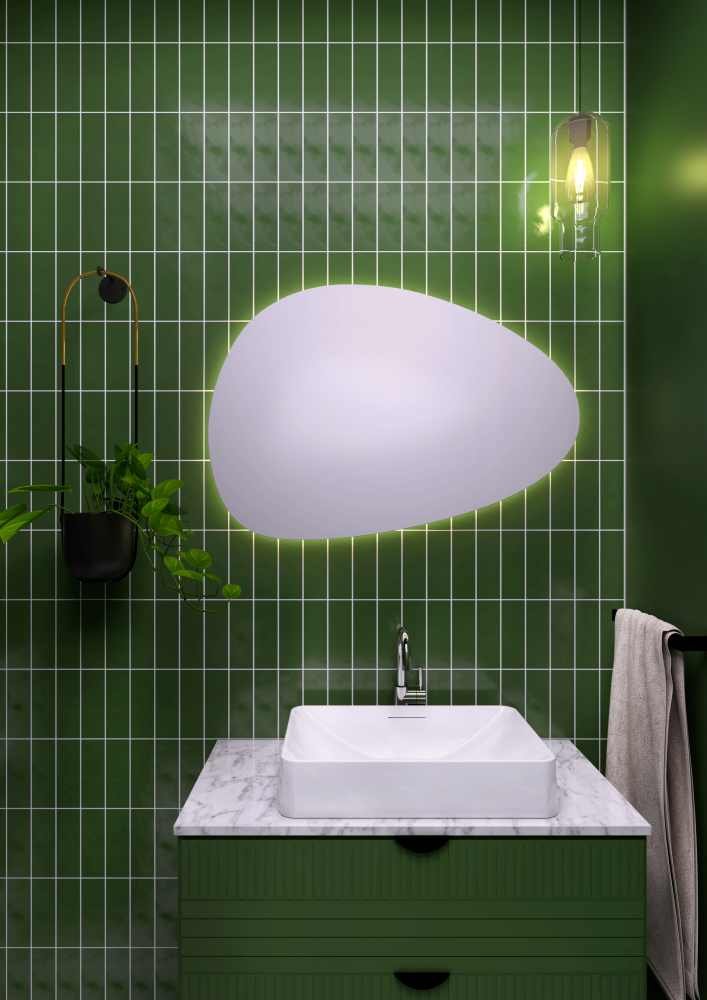 Dekoratívne zrkadlo s LED podsvietením zozadu (backlit) v tvare nepravidelného obdĺžnika / oválu, ktoré je možné zavesiť vertikálne alebo horizontálne. Má krytie IP44, vhodné do kúpeľní.
