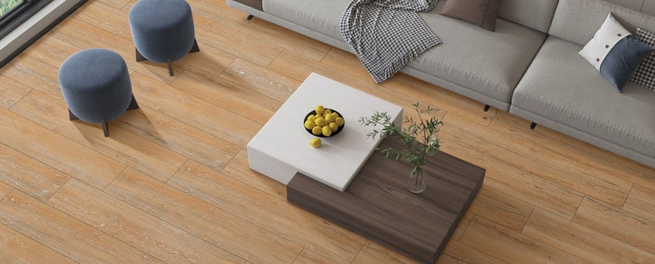 Rektifikovaná dlažba s realistickou kresbou dreva v teplom odtieni Beige. Spojenie prírodného vzhľadu a odolnosti bez nutnosti údržby.