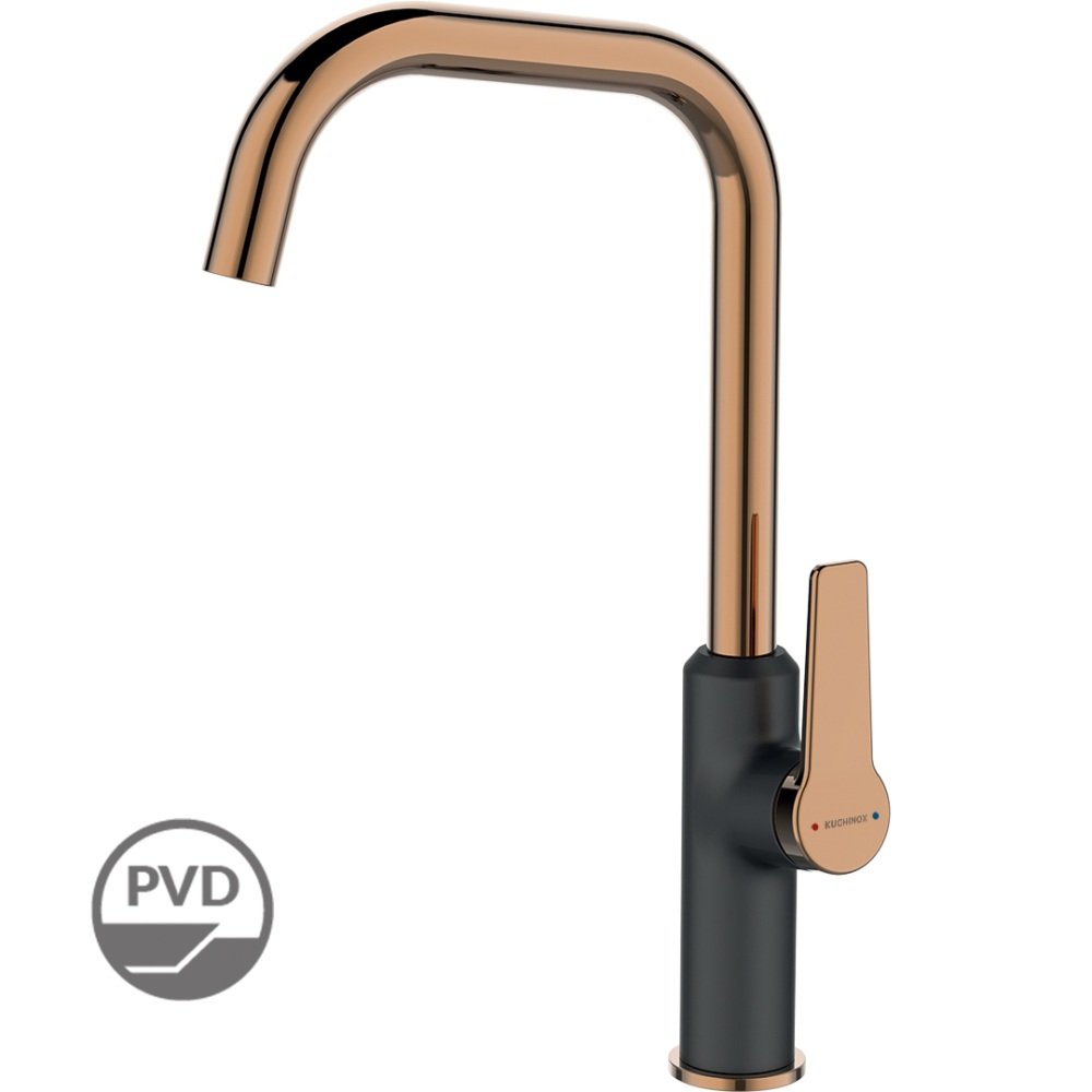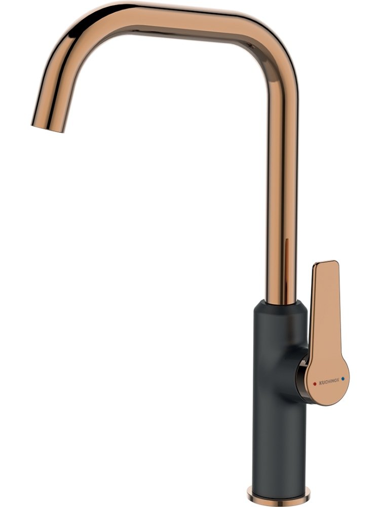 Elegantná stojaca kuchynská batéria Kuchinox Alanis s výtokom v tvare „L“, čierne / ružové zlaté prevedenie, jednopáková regulácia, keramická kartuša Ø 25 mm, akustická trieda I (≤ 20 dB), trieda prietoku A ≤ 15 l/min a dômyselná montáž „easy fix“. Kód produktu: BQI 865