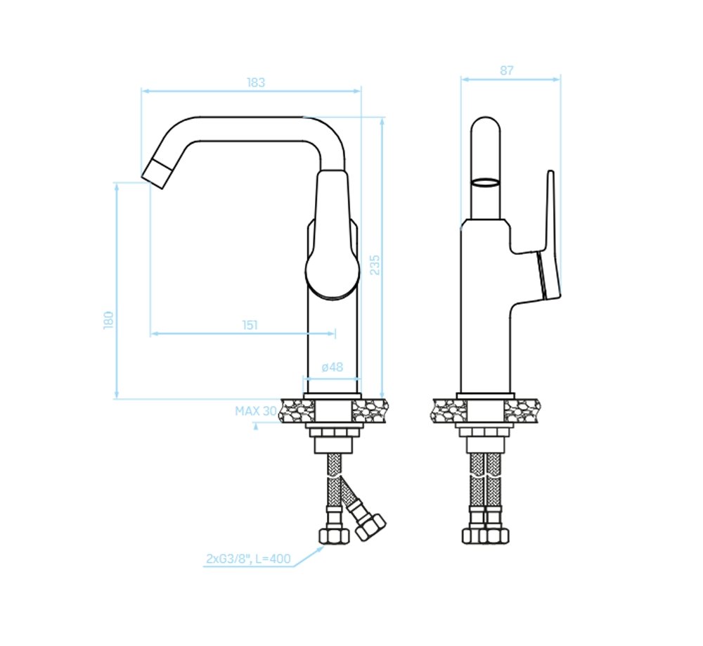 ALANIS stojanová umývadlová batéria s výtokovým ramienkom L je dokonalou kombináciou moderného dizajnu, precíznej funkčnosti a luxusnej elegancie. Jednouchytová batéria s keramickou hlavicou (⌀26 mm) zabezpečuje presné a hladké ovládanie teploty a prietoku vody. Výtokové ramienko s aerátorom Neoperl zaisťuje úsporu vody a tichý prúd.