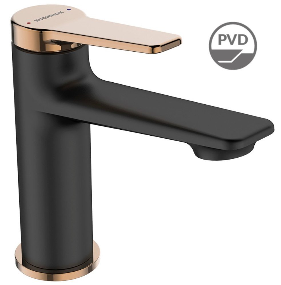 Elegantná dizajnová batéria Kuchinox ALANIS v kombinácii čiernej a ružového zlata, určená na montáž na umývadlo. Má jednoručkové ovládanie, výpustný mechanizmus typu klik‑klak a keramickú hlavicu ⌀ 26 mm. Výtok je pevný, s dosahom 120 mm, končí aerátorom Neoperl. Garantovaná úroveň hluku je ≤ 20 dB a maximálny prietok ≤ 15 l/min. Záruka: 5 rokov na telo a kartušu. Modelový kód: BQI 822D.