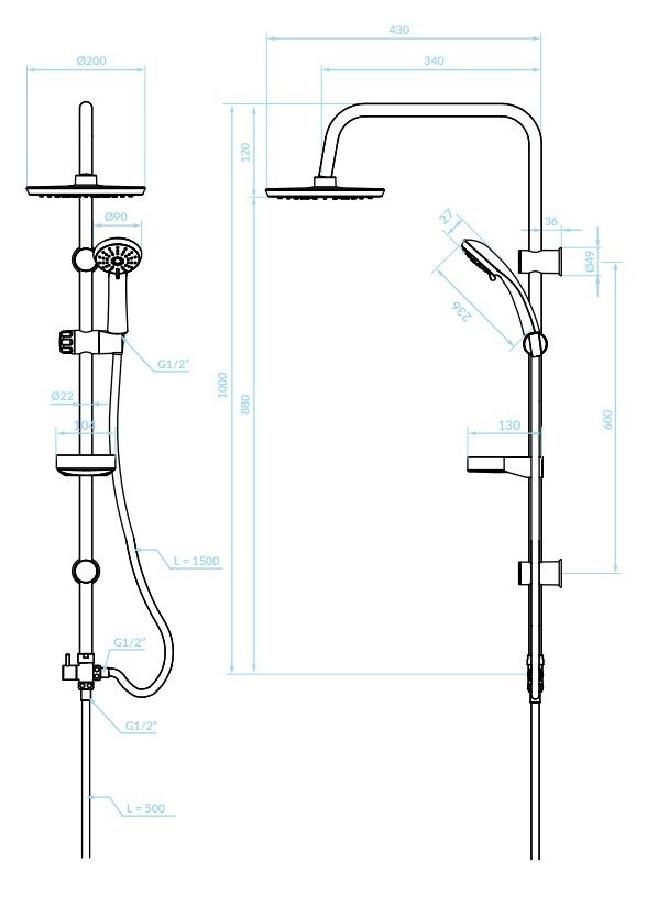Set je stavaný pre montáž na stenu (výška 1000 mm, šírka 200 mm, hĺbka 430 mm) a disponuje nastaviteľným rozstupom uchytenia, čo uľahčuje inštaláciu. Vysokokvalitné materiály – mosadz, oceľ, plast a gumová hadica v oceľovom opletení – zaručujú dlhú životnosť. Hadica s dĺžkou 1500 mm poskytuje dostatočný dosah na pohodlné používanie. Súčasťou výbavy je aj mydelnička, takže doplnky ako mydlo či špongia majú svoje miesto bez nutnosti ďalšieho príslušenstva.