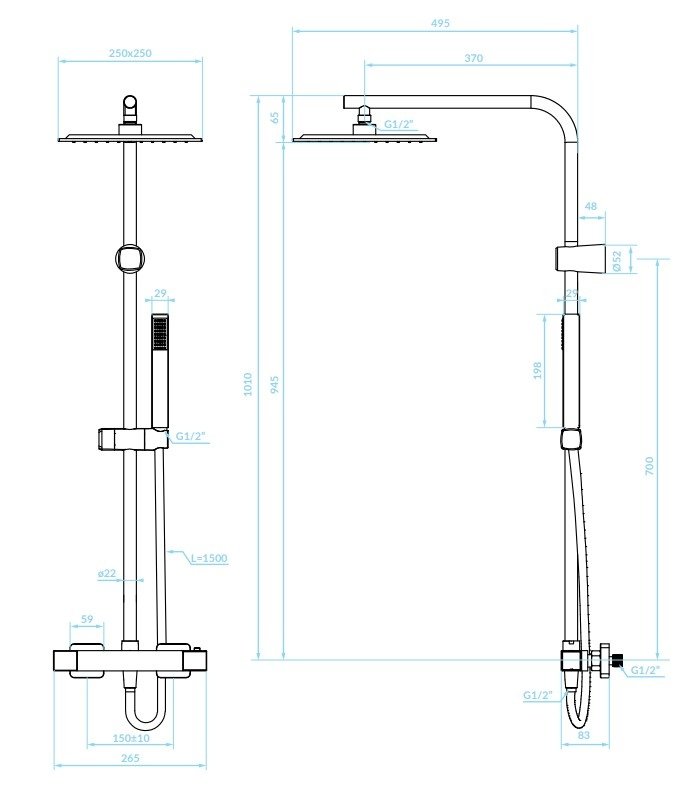 Horná dažďová sprcha s rozmermi 250 × 250 mm poskytuje bohatý prúd vody a pôsobivý sprchový zážitok. Ručná sprcha má rozmery 198 × 29 mm, poskytuje pohodlné použitie a jednoduché ovládanie. Celková výška stĺpu je 970 mm (alebo výška od steny môže byť cca 1010 mm včítane výbavy) a hĺbka systému je približne 495 mm, šírka ~265 mm. Termostatická batéria umožňuje udržať konštantnú teplotu vody, čím výrazne zvyšuje komfort sprchovania a bezpečnosť – ideálne pri domácnostiach s deťmi či staršími osobami. K tomu systém anti-calc (proti usádzaniu vodného kameňa) a systém proti pretočeniu hadice (anti-twist) zaručujú jednoduchšiu údržbu a dlhšiu životnosť. Prietoková trieda je A ≤ 15 l/min, akustická skupina II (< 20 ≤ 30 dB) – technické parametre, ktoré spĺňajú moderné požiadavky.