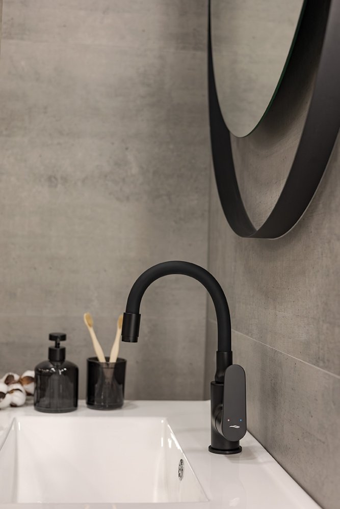DIMA stojaca umývadlová batéria s elastickou výpustnou hubicou v elegantnej matnej čiernej – dokonalá voľba pre moderné kúpeľne. Jednocomandová batéria s keramickou kartušou Ø 35 mm, možnosťou otáčania výpustnej hadice v rozsahu 50 – 240 mm, nízkou hlučnosťou (≤ 20 dB)