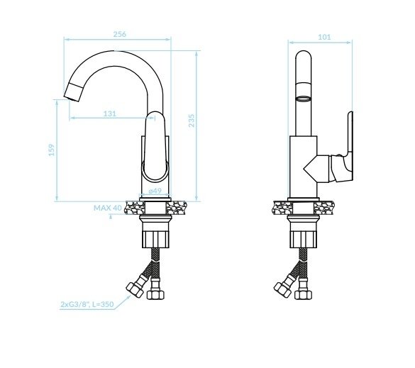 Batéria má dosah výpustu 131 mm, čo je vhodné pre normálne rozmery umývadiel, a celkovú výšku 235 mm, čo poskytuje dostatočný priestor pod výpustom pre pohodlné používanie. Prívodné hadice v dĺžke 35 cm zjednodušujú pripojenie k vodovodnej rozvodnej sieti. Systém jednoduchého montovania (easy mount) znižuje náročnosť montáže a urýchľuje inštaláciu.